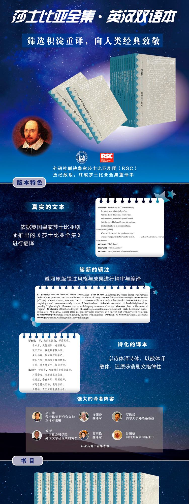 这是英国大作家本·琼森在第一部《莎士比亚全集》扉页上题诗中的诗行。三百多年来,莎士比亚在全球逐步成为一个家喻户晓的名字,似乎与这句预言在在呼应。但这并非偶然言中,有许多因素可以解释莎士比亚这一巨大的文化现象产生的必然性。至少有下面几点。
