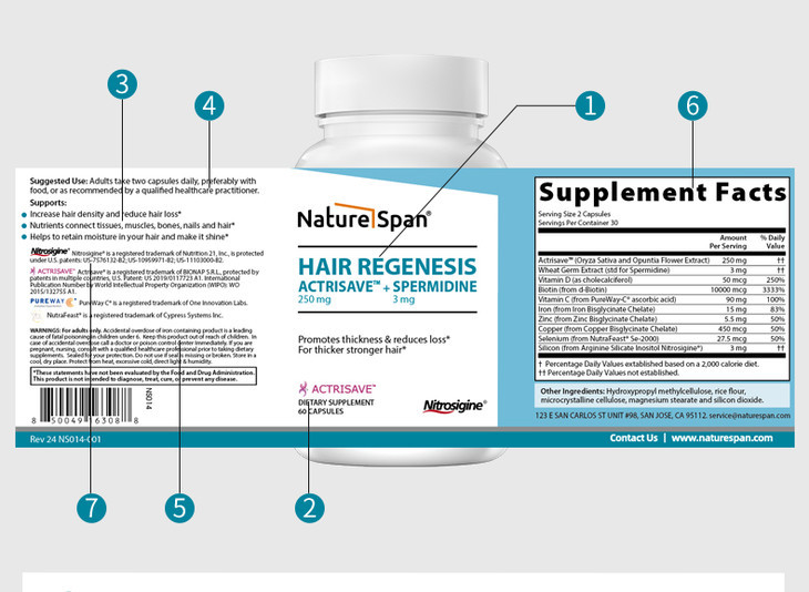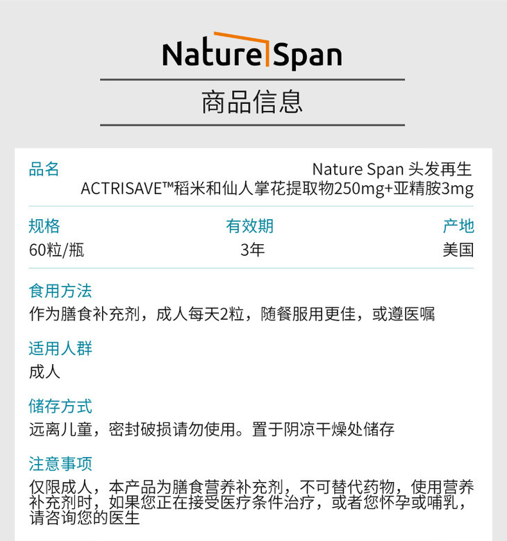亚精胺头发配方ACTRISAVE™ 美国进口胶囊60粒/瓶NatureSpan倍能适