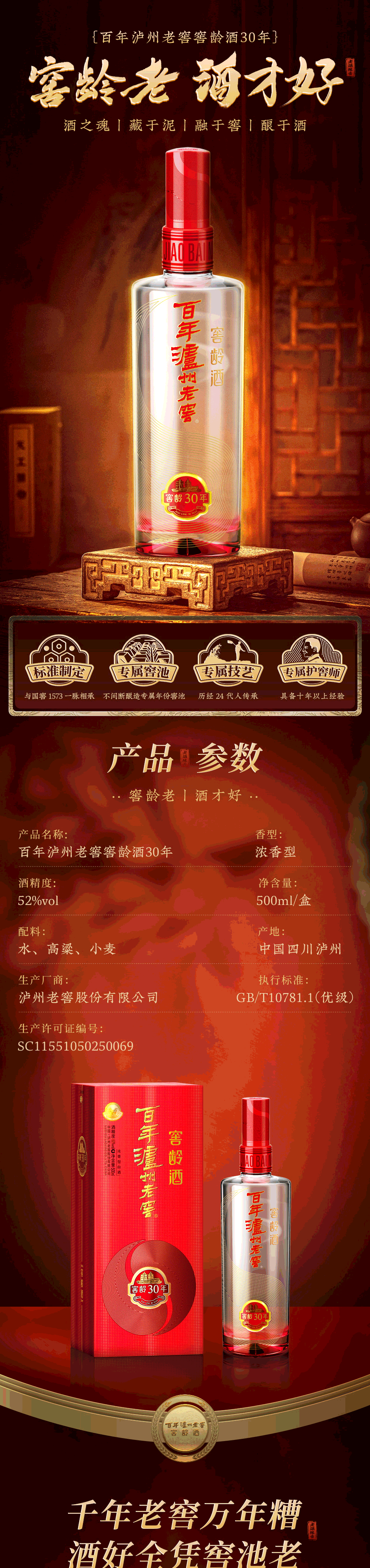 【泸州老窖形象店】52度百年泸州老窖窖龄酒30年 500ml*6整箱 浓香型白酒