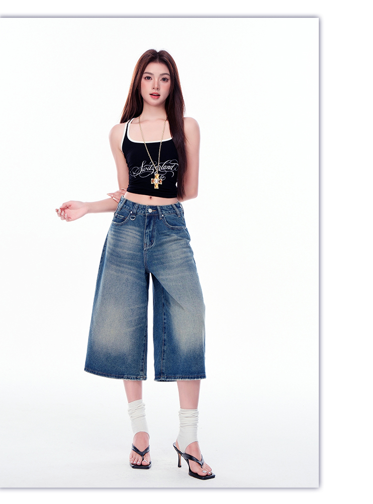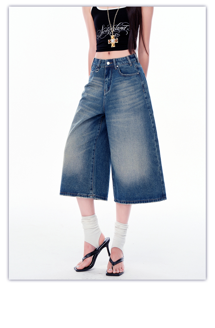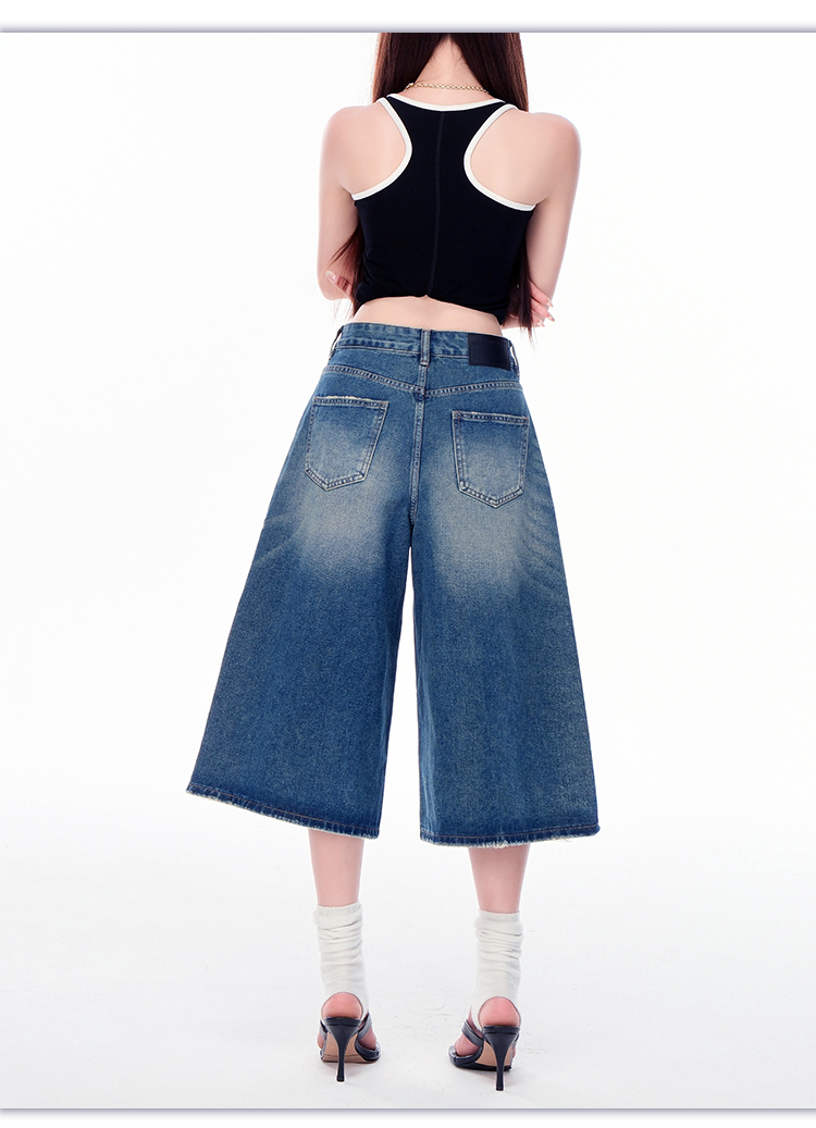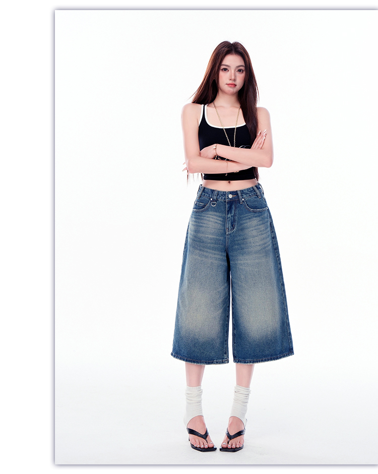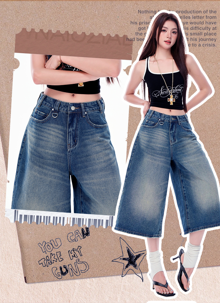 罗蒙女士七分牛仔裤夏季薄款水洗做旧高腰宽松显瘦阔腿短裤子