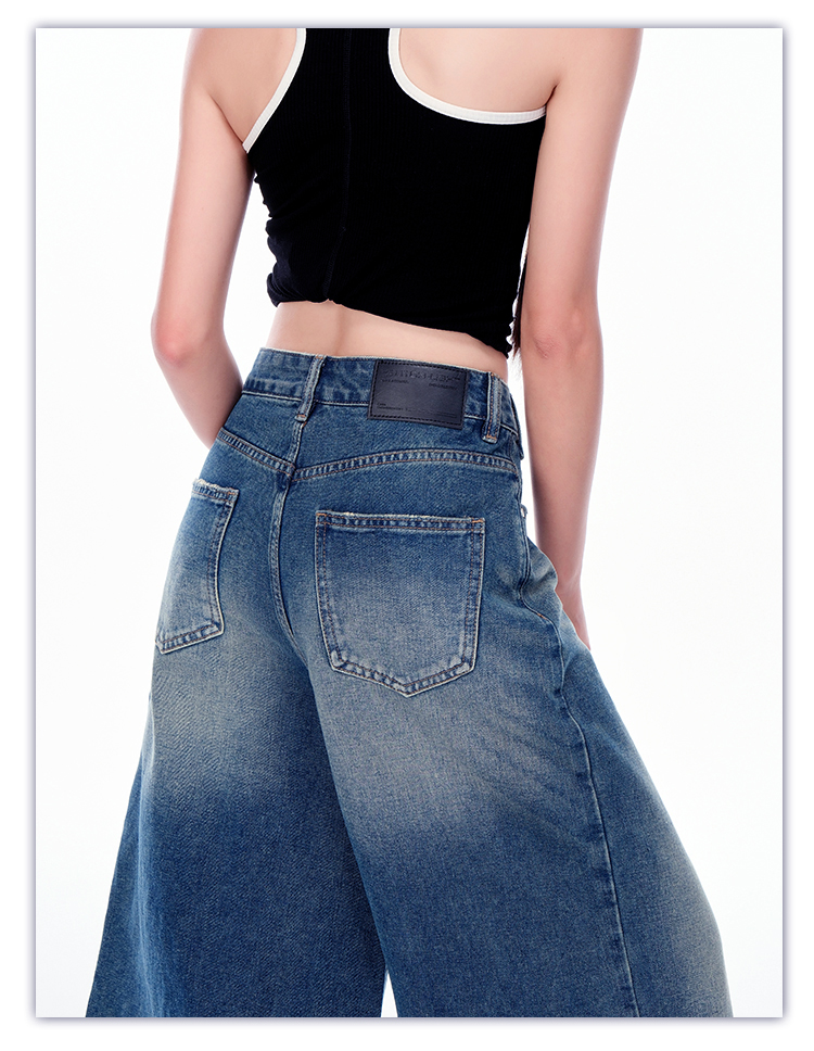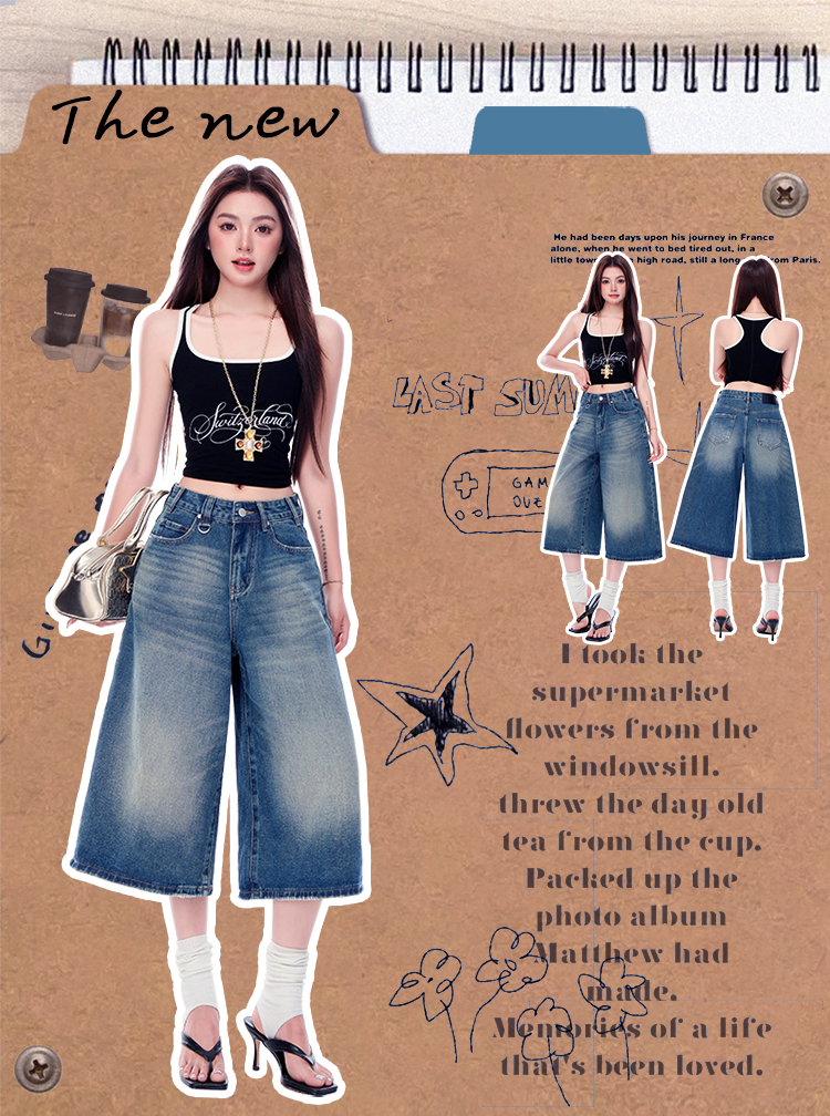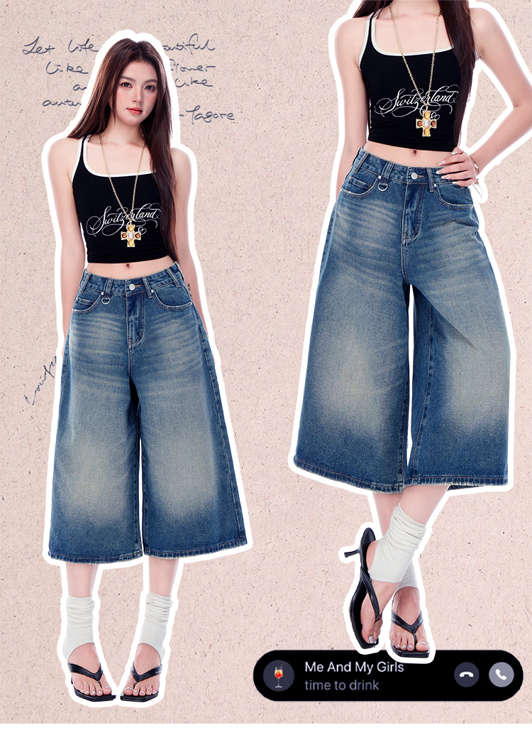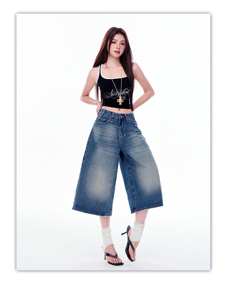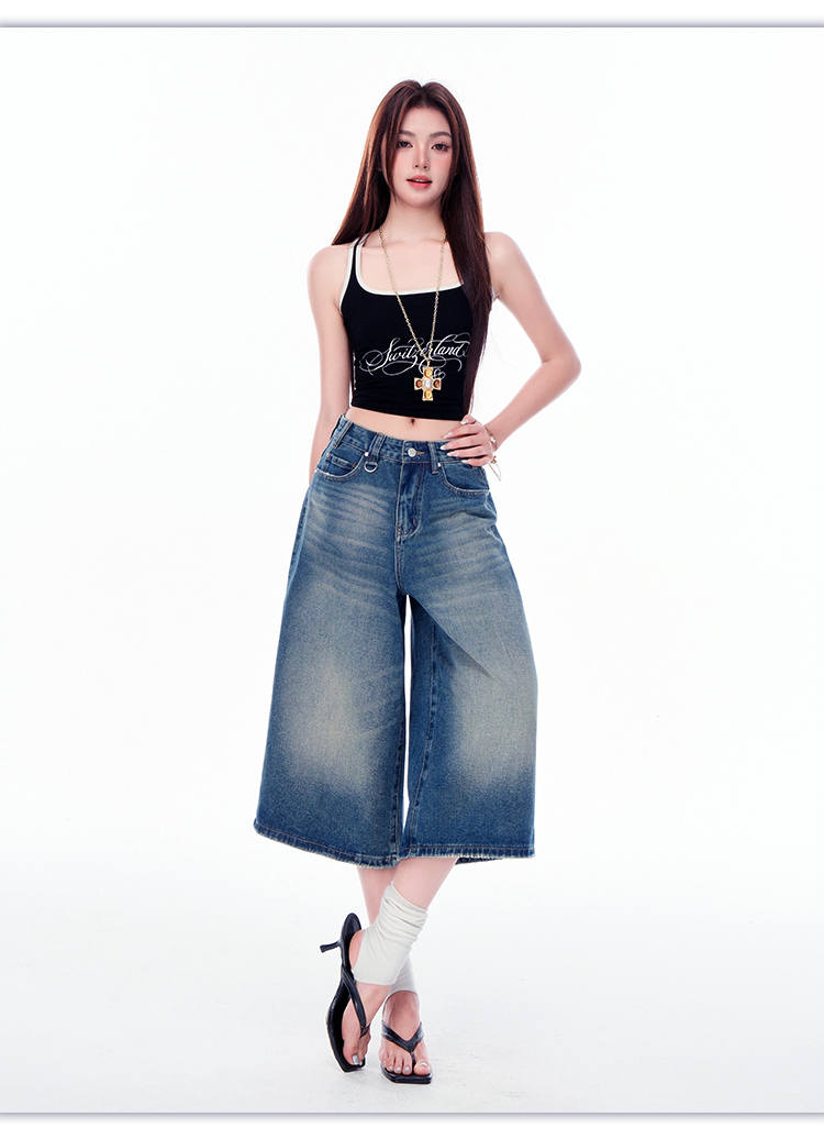 罗蒙女士七分牛仔裤夏季薄款水洗做旧高腰宽松显瘦阔腿短裤子