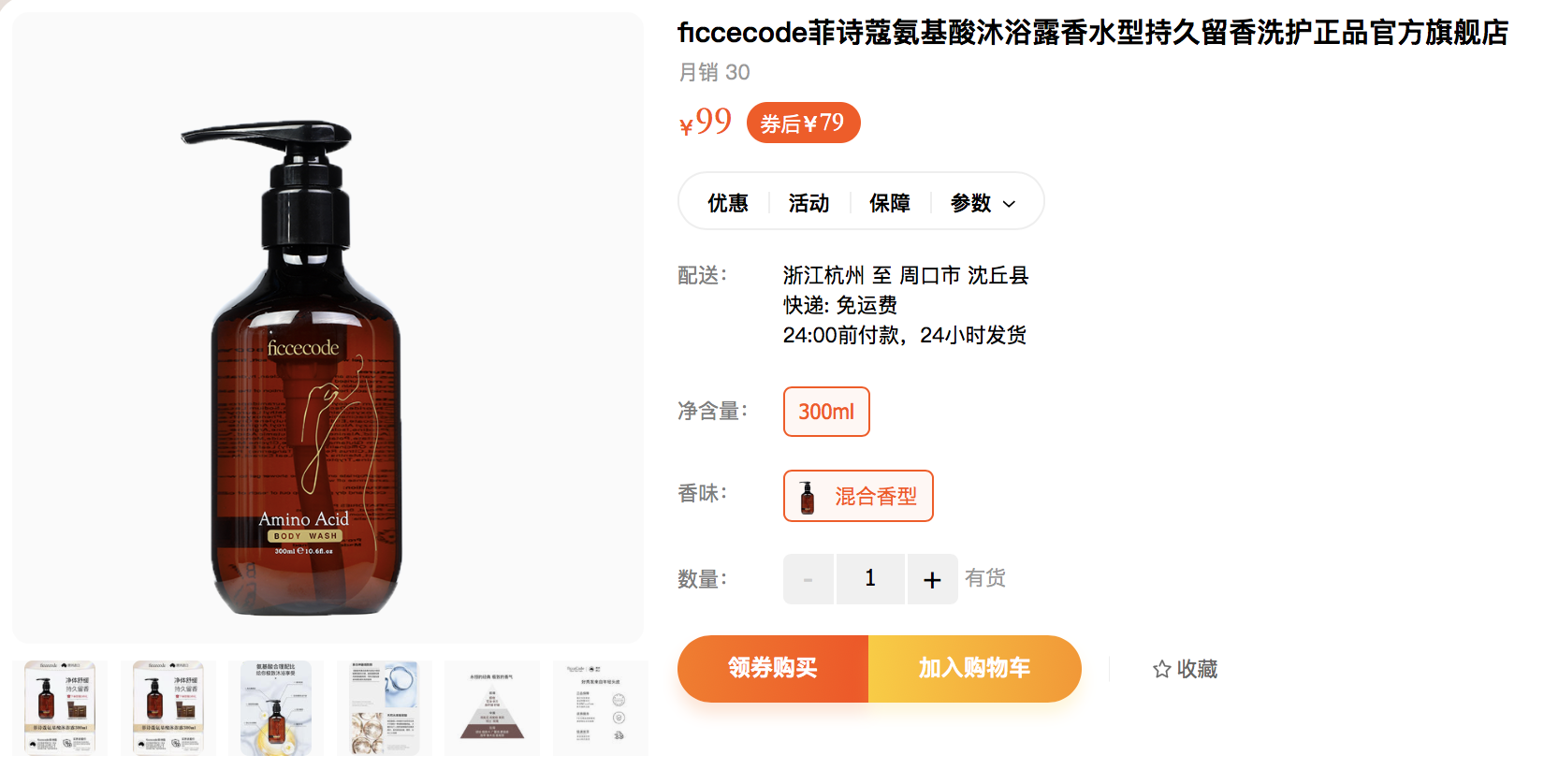 【清仓好价】FicceCode菲诗蔻氨基酸沐浴露300ml