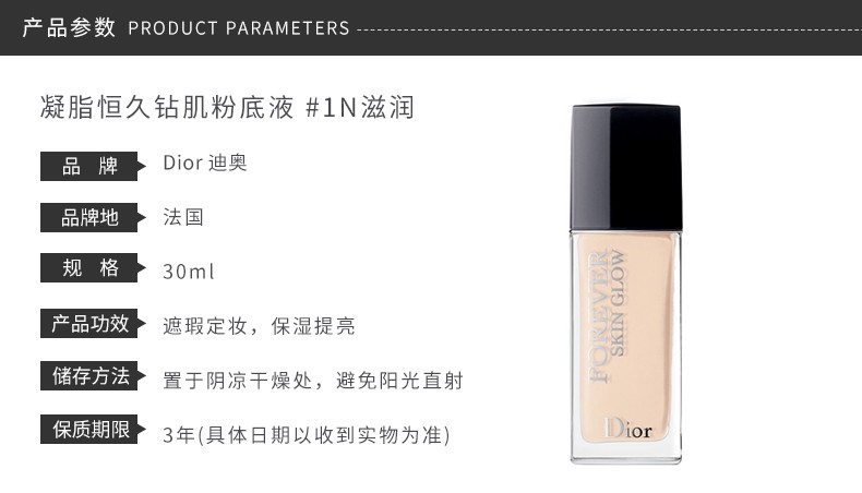 DIOR迪奥 FOREVER凝脂恒久长效钻肌光泽滋润粉底液 SPF35 PA++ 1N 法国