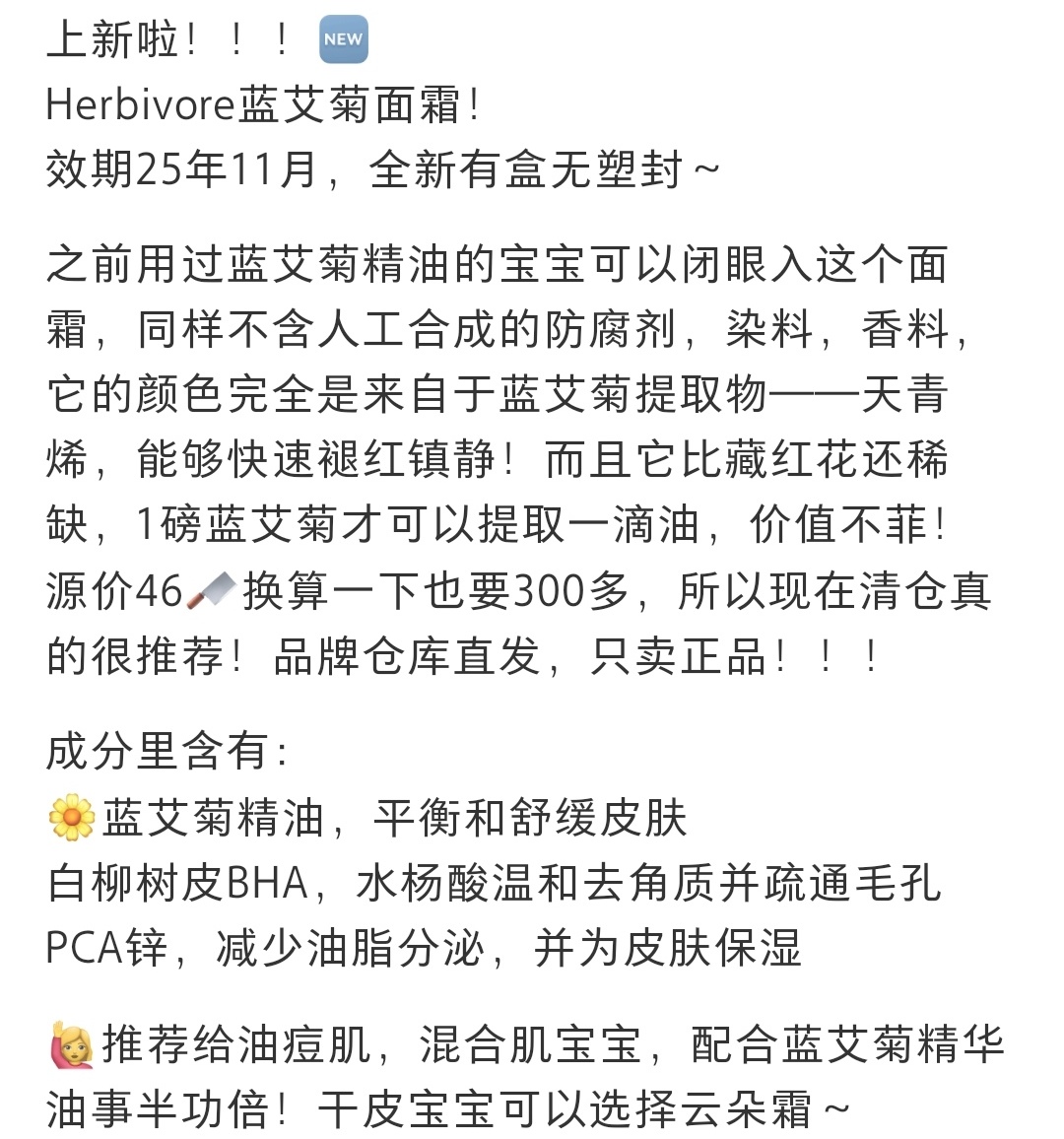 【清仓好价】美国 Herbivore蓝艾菊水瓶座平衡面霜50ml(效期至25.11后)
