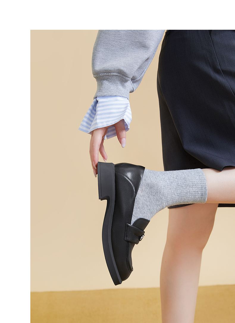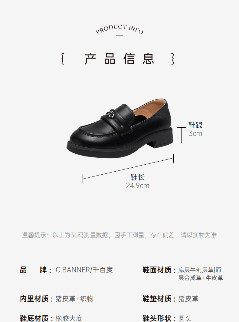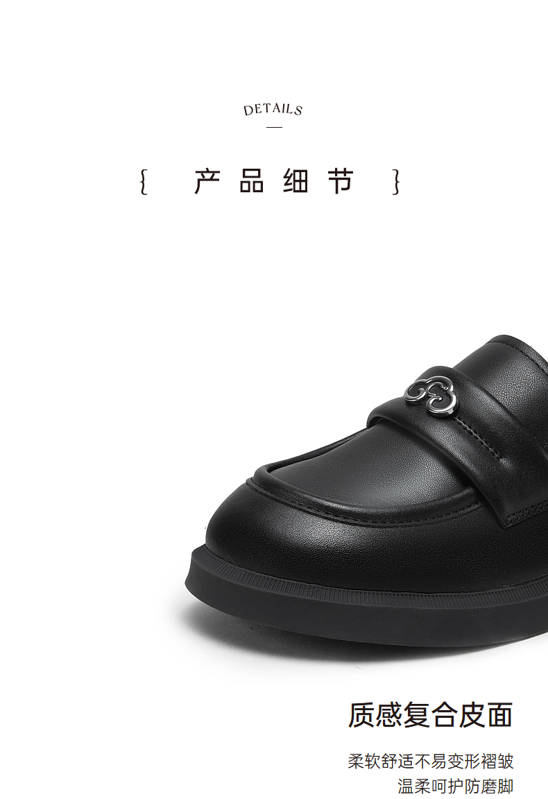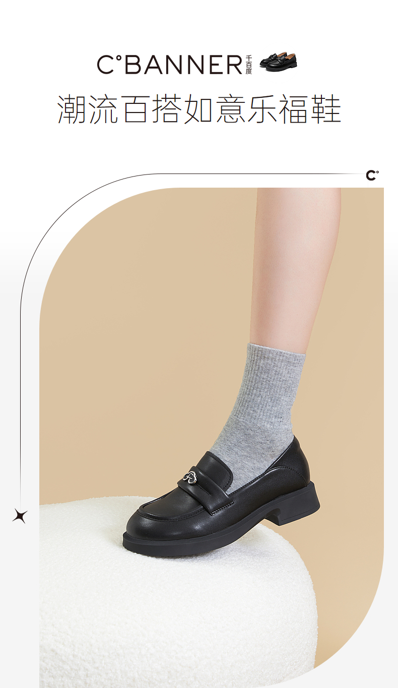 千百度黑色乐福鞋女秋季正装通勤英伦风小皮鞋一脚蹬鞋子A23431835