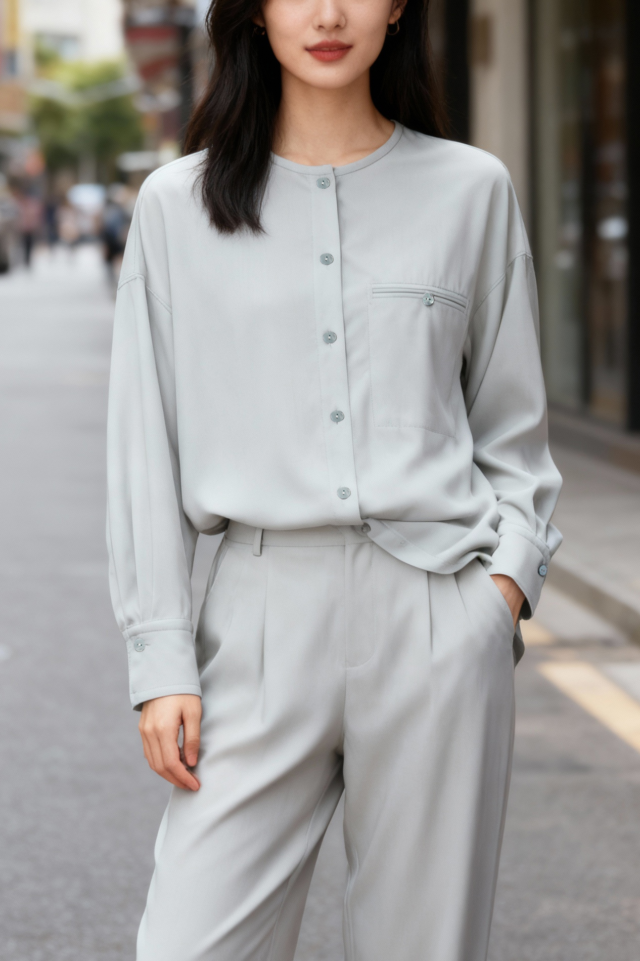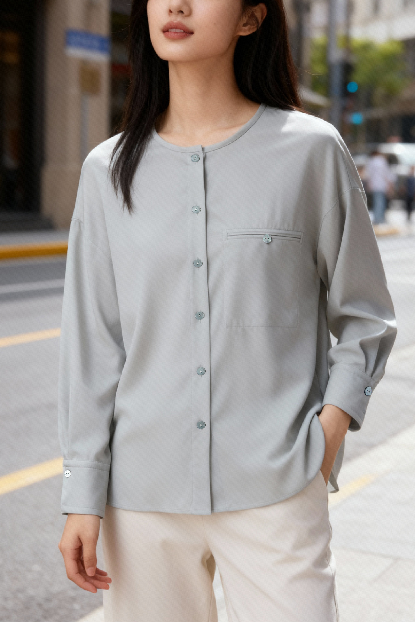 低饱和度色调契合诧寂核心,褪去浮华,留下纯粹质感。圆领设计柔和不挑脖颈线条,左胸带扣口袋是点睛之笔,实用又添细节层次,没有多余装饰,却在剪裁与材质上暗藏巧思。