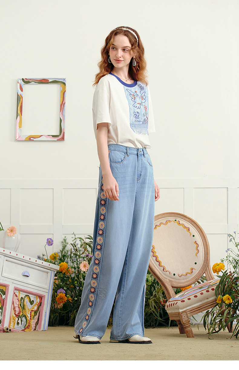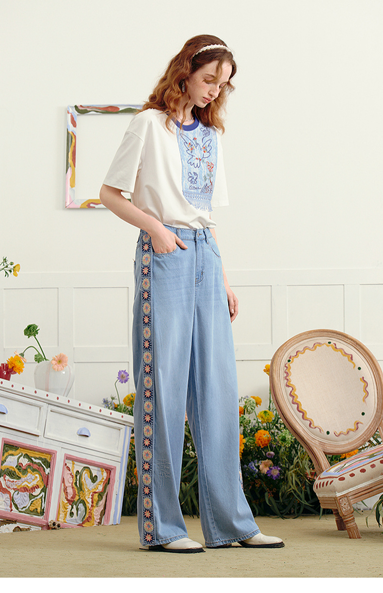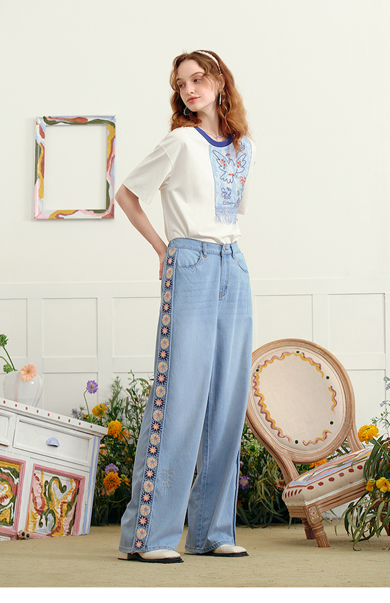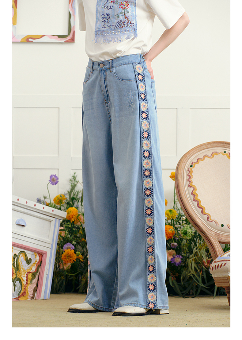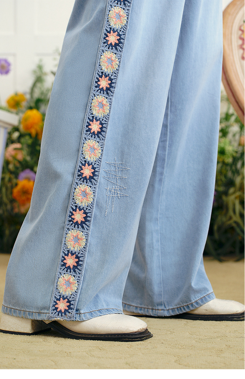 两三事 浮花蓝夏 2025夏季新款森女风绣花织带拼接直筒牛仔裤女