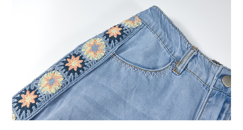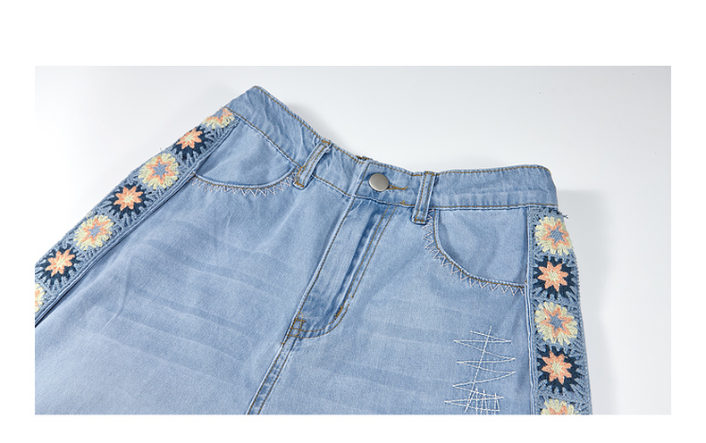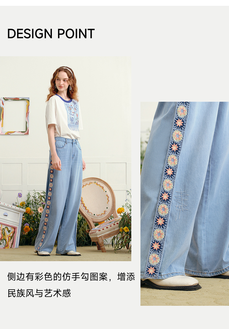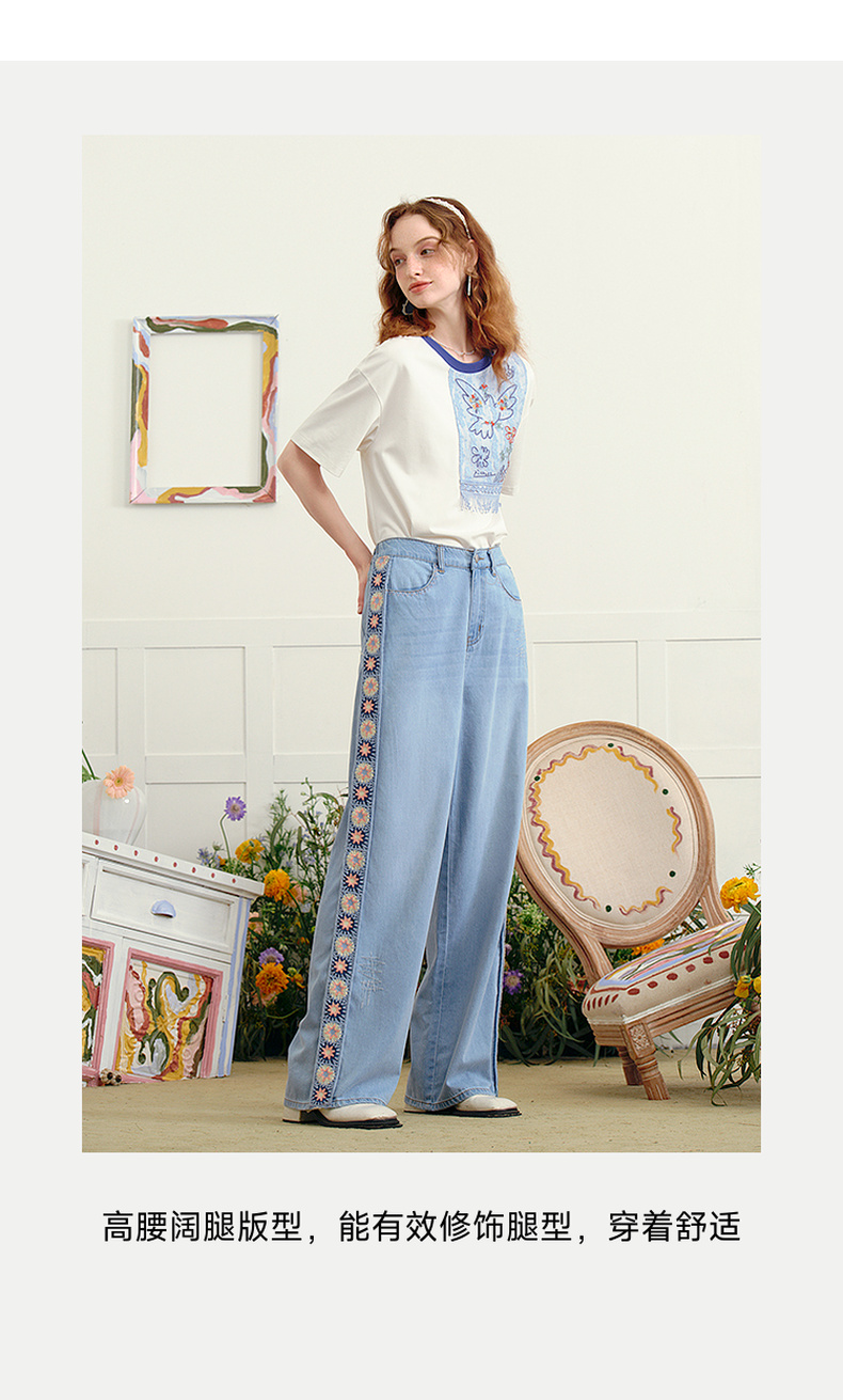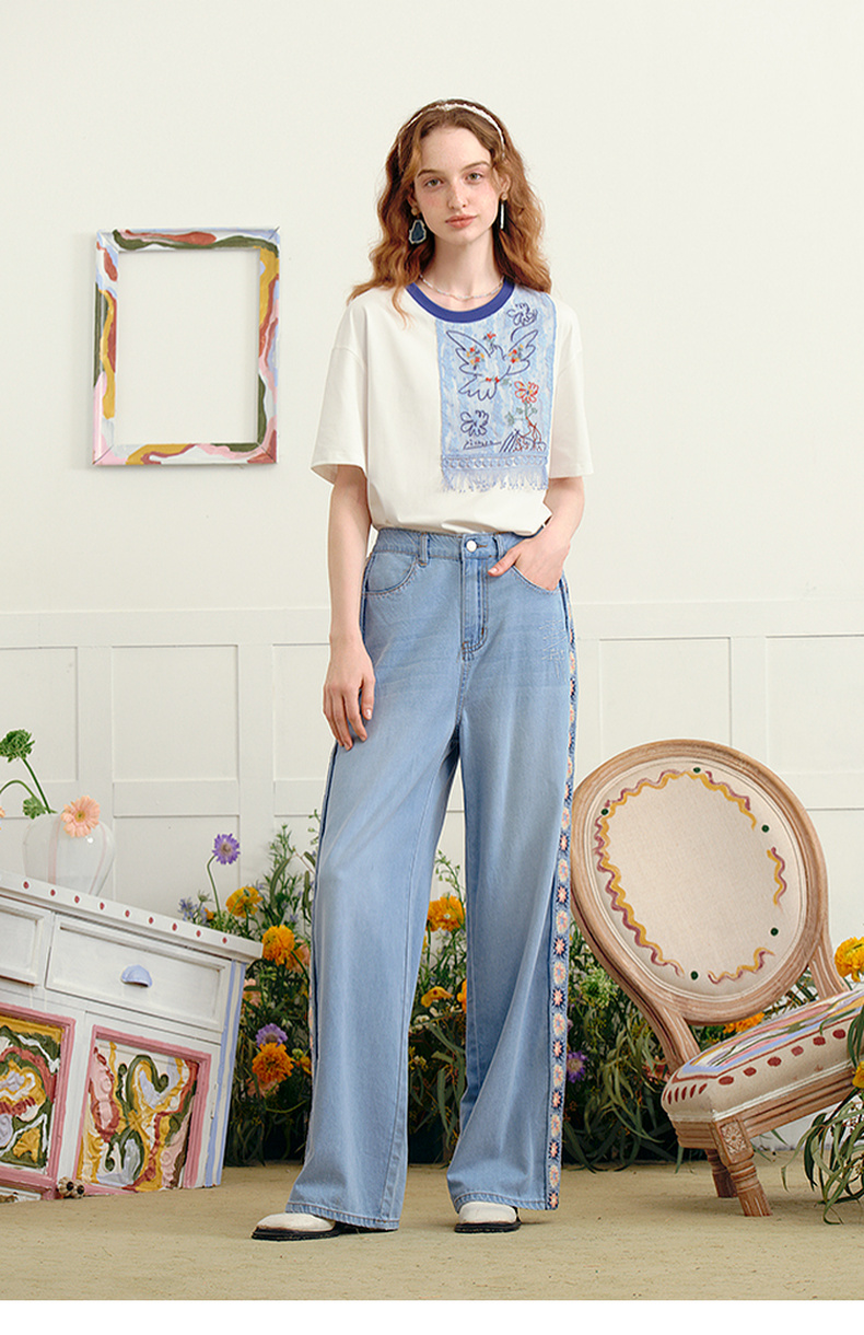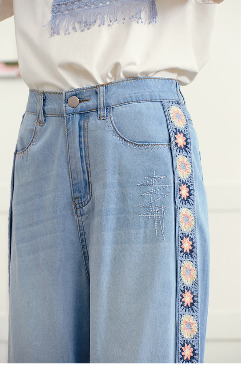 两三事 浮花蓝夏 2025夏季新款森女风绣花织带拼接直筒牛仔裤女