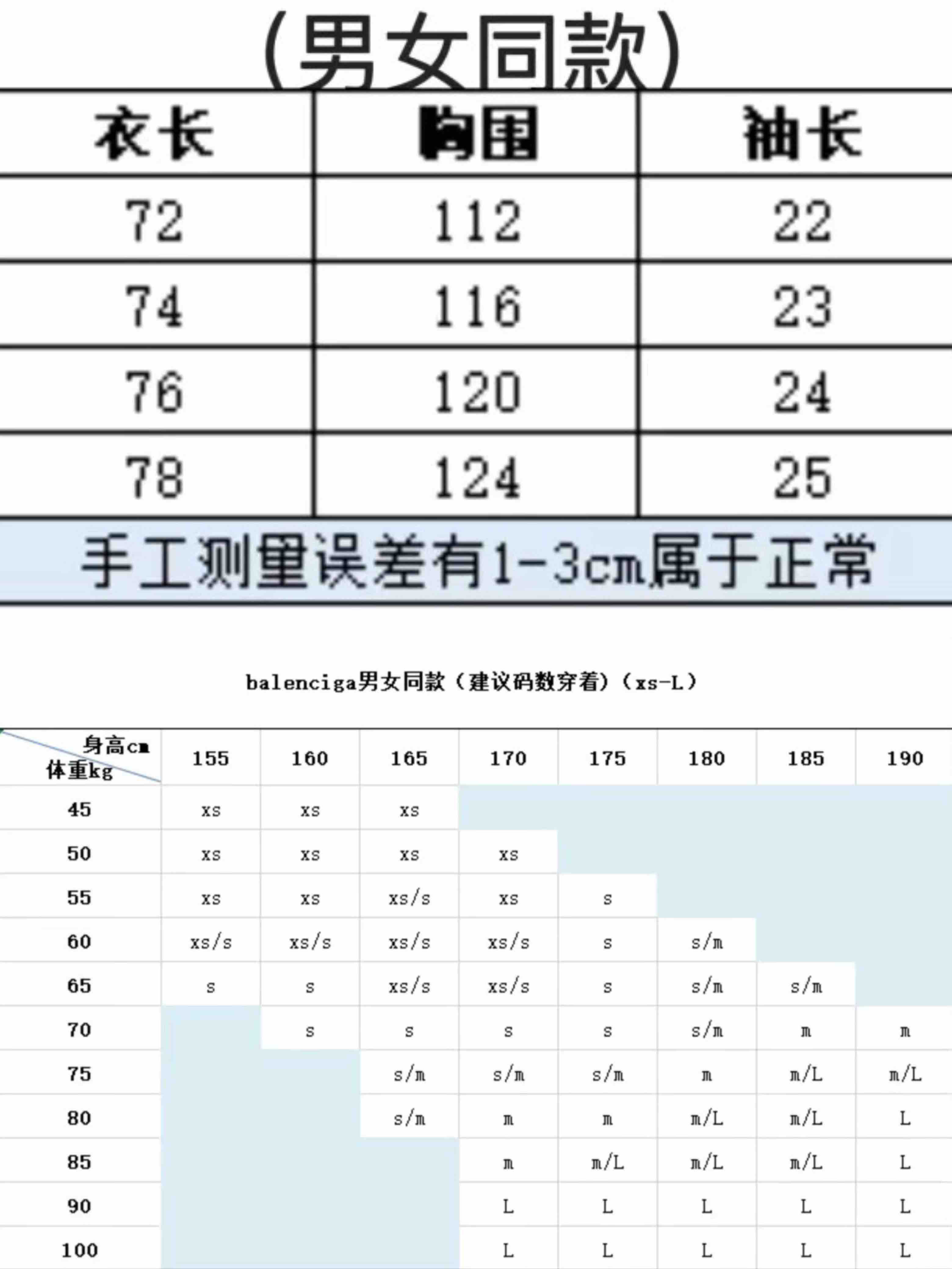尺码xs-L