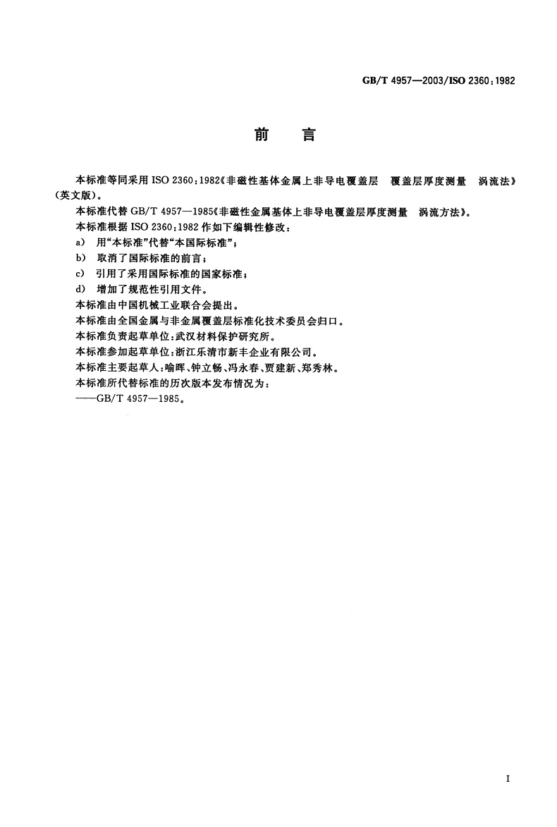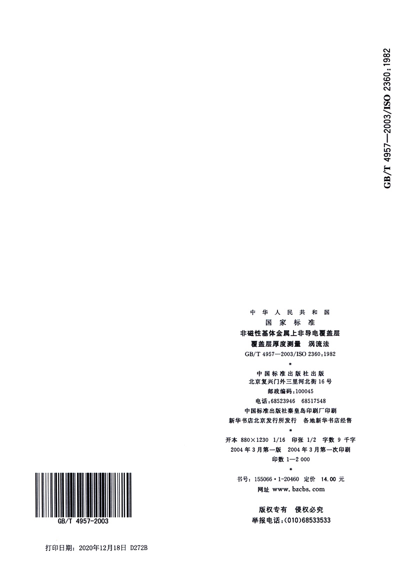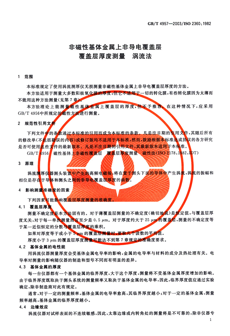 书名:速印不退 GB/T 4957-2003 非磁性基体金属上非导电覆盖层覆盖层厚度测量 涡流法