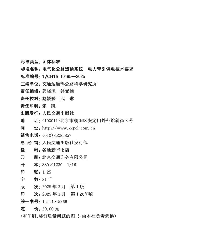 书名:电气化公路运输系统 电力牵引供电技术要求(T/CHTS 10195—2025)