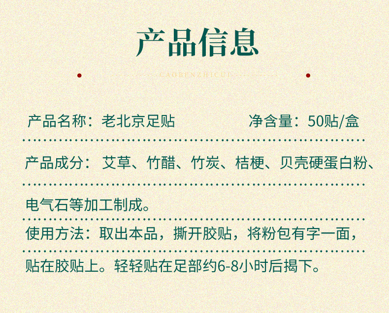 【商品名称】老北京足贴 【产品规格】一盒50贴 【成分】竹醋、竹炭、贝壳硬蛋白粉、艾草、抗坏血酸(维生素)、桔梗(p[atycodongrandiflorum)提取物、电气石。 【保质期】36个月 【产地】河南 【合作快递】极兔快递;中通快递 【不发货地区】新疆、西藏及港澳台 【售后标准】不影响二次销售的前提下,支持七天无理由退货 【注意事项】 1、只供外用,眼部、伤口部位禁用: 2、婴幼儿、孕妇、皮肤过敏者禁用; 3、本品为艾草制品,不代替药品和医疗器械治疗; 4、请放置于儿童接触不到的地方,如有误食,请立即就医。使用过程中若有任何不良反应请及时就医。 |
