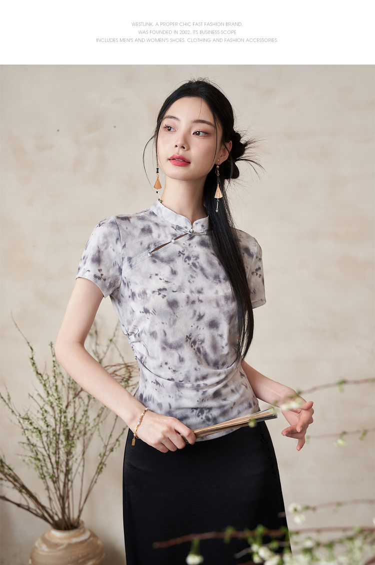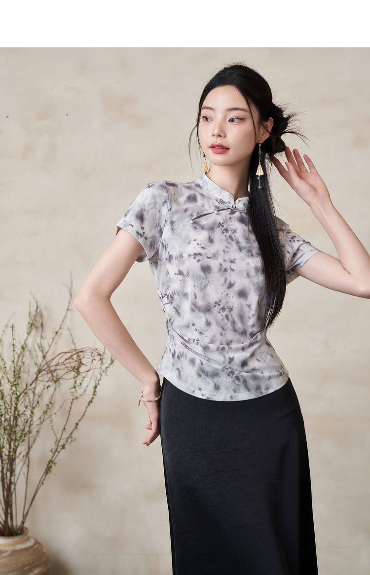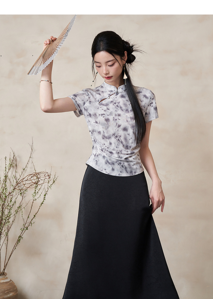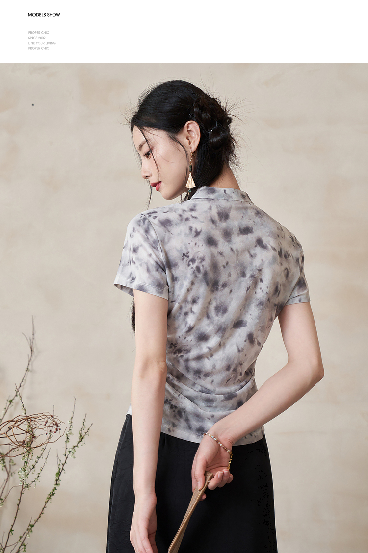 新中式国风小立领一字扣扎染T恤女夏季设计感开叉T恤V2241625