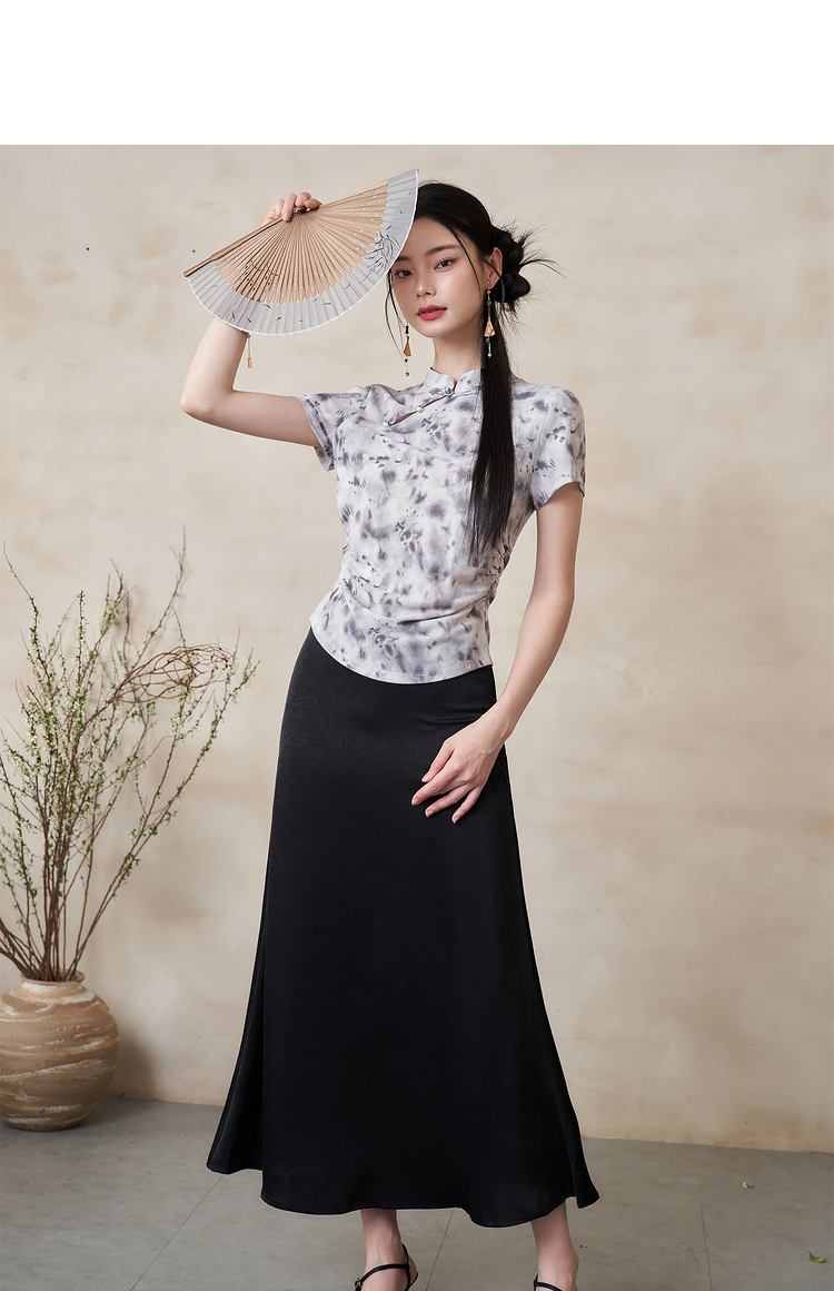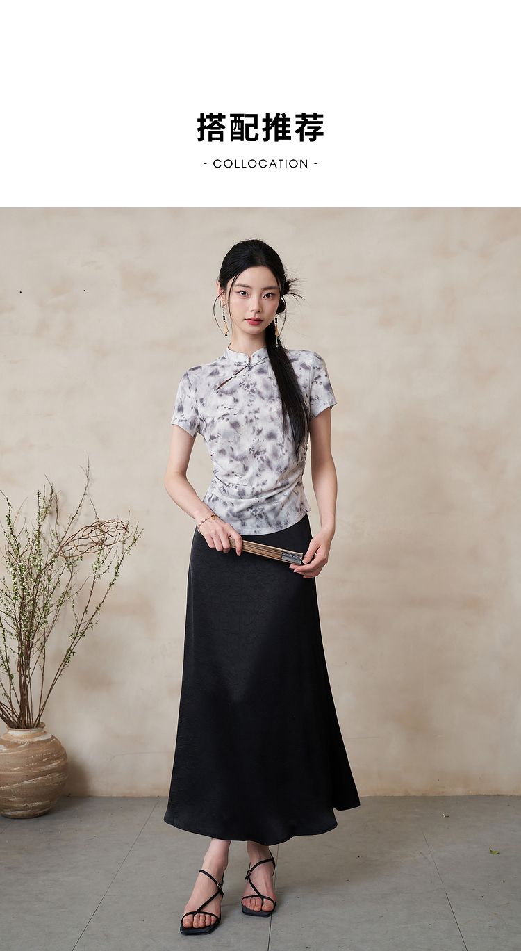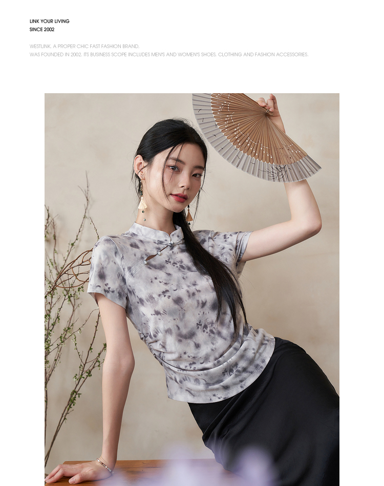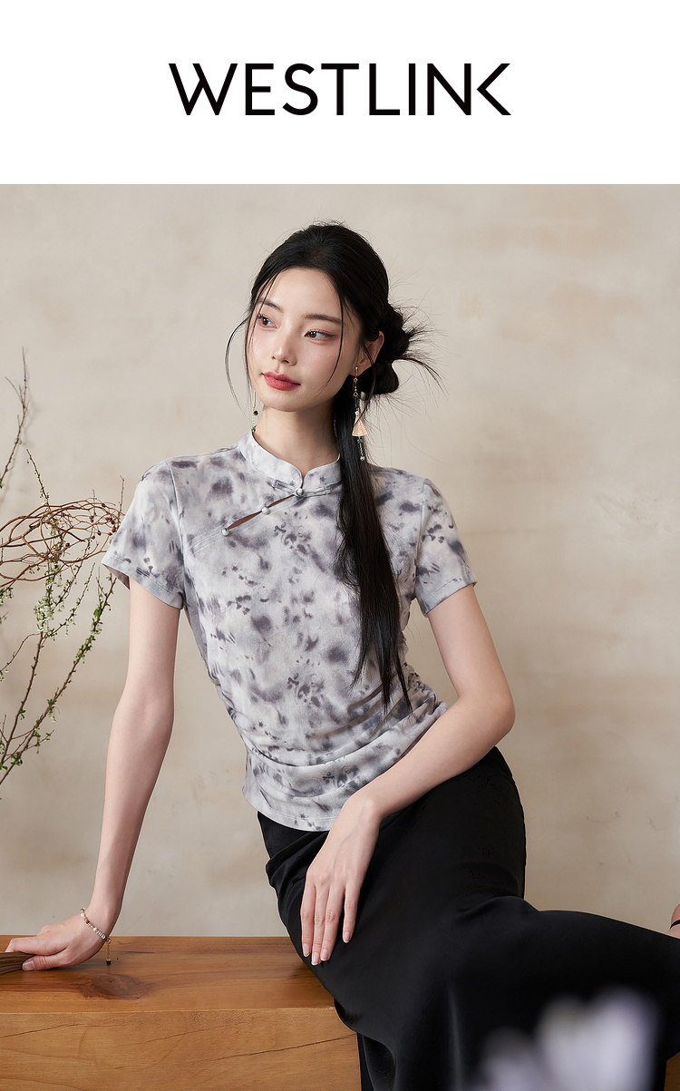 新中式国风小立领一字扣扎染T恤女夏季设计感开叉T恤V2241625