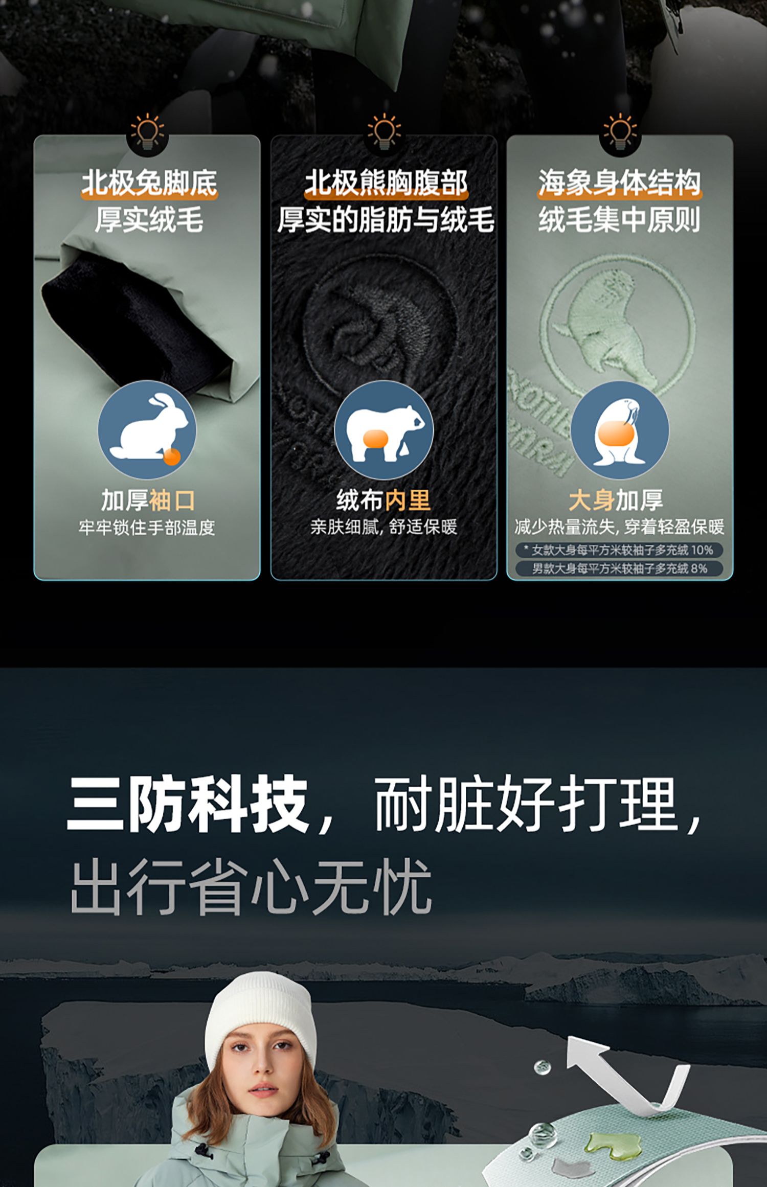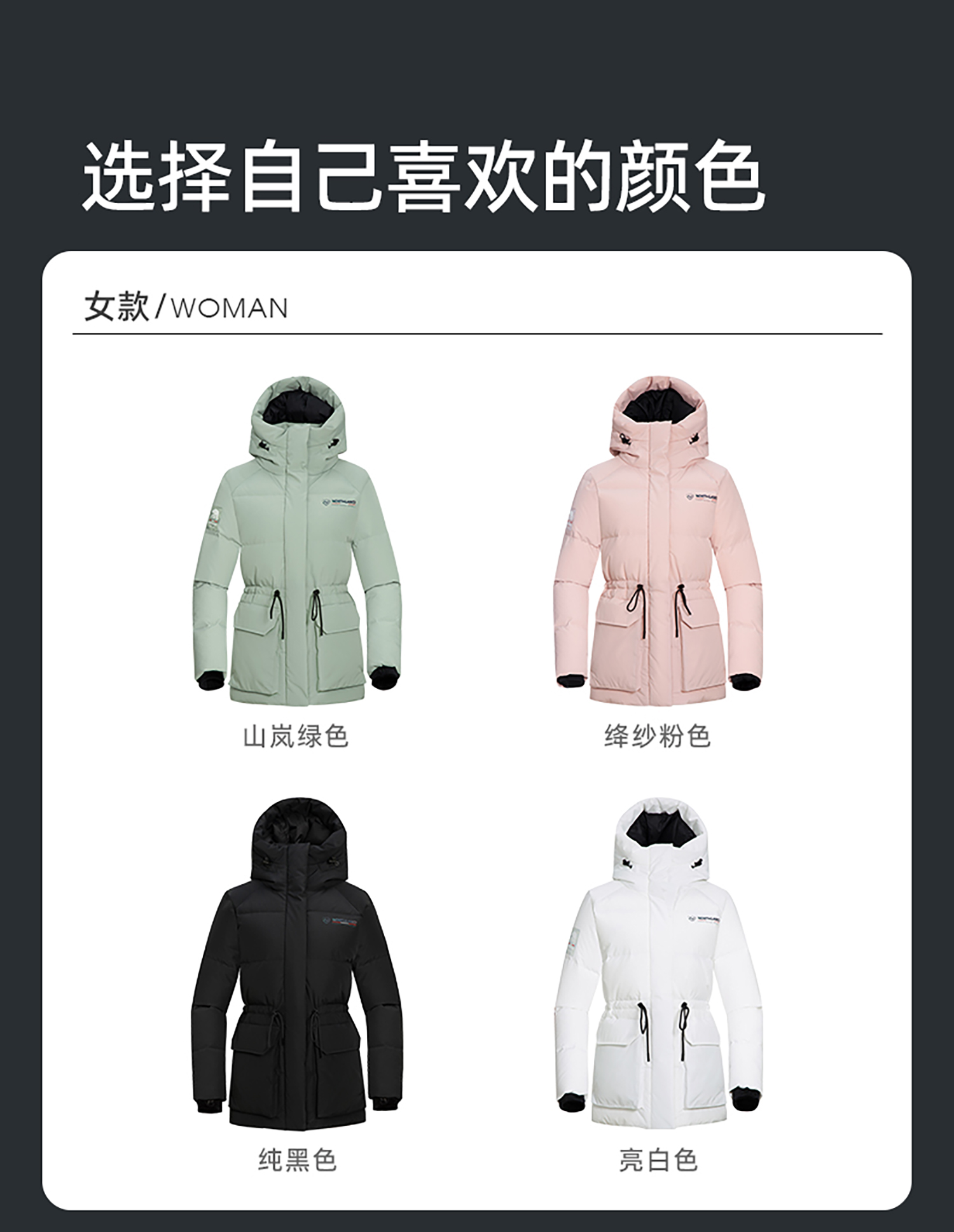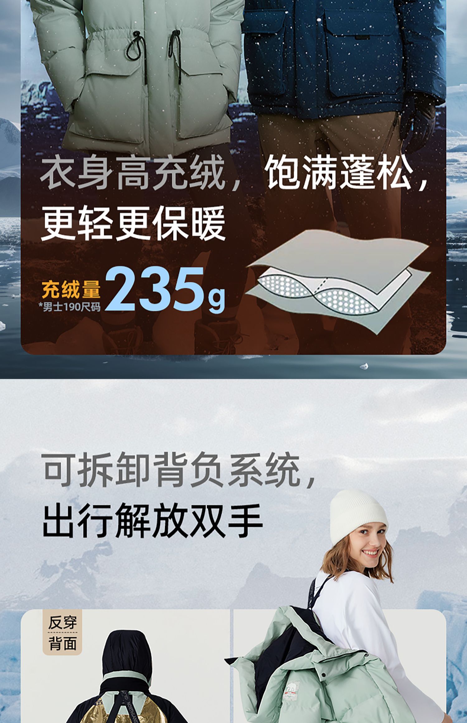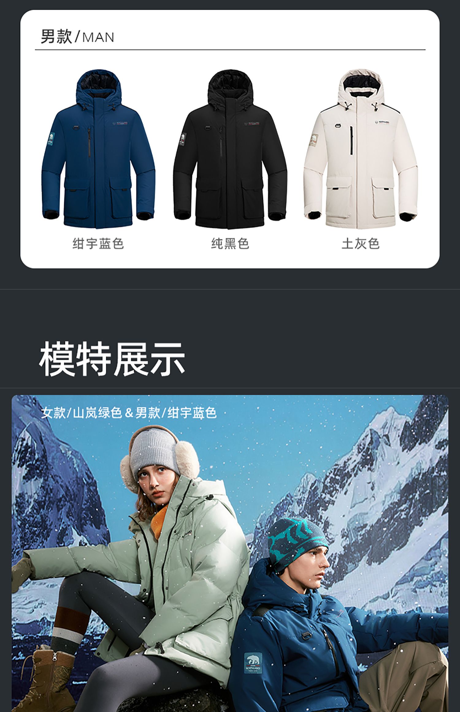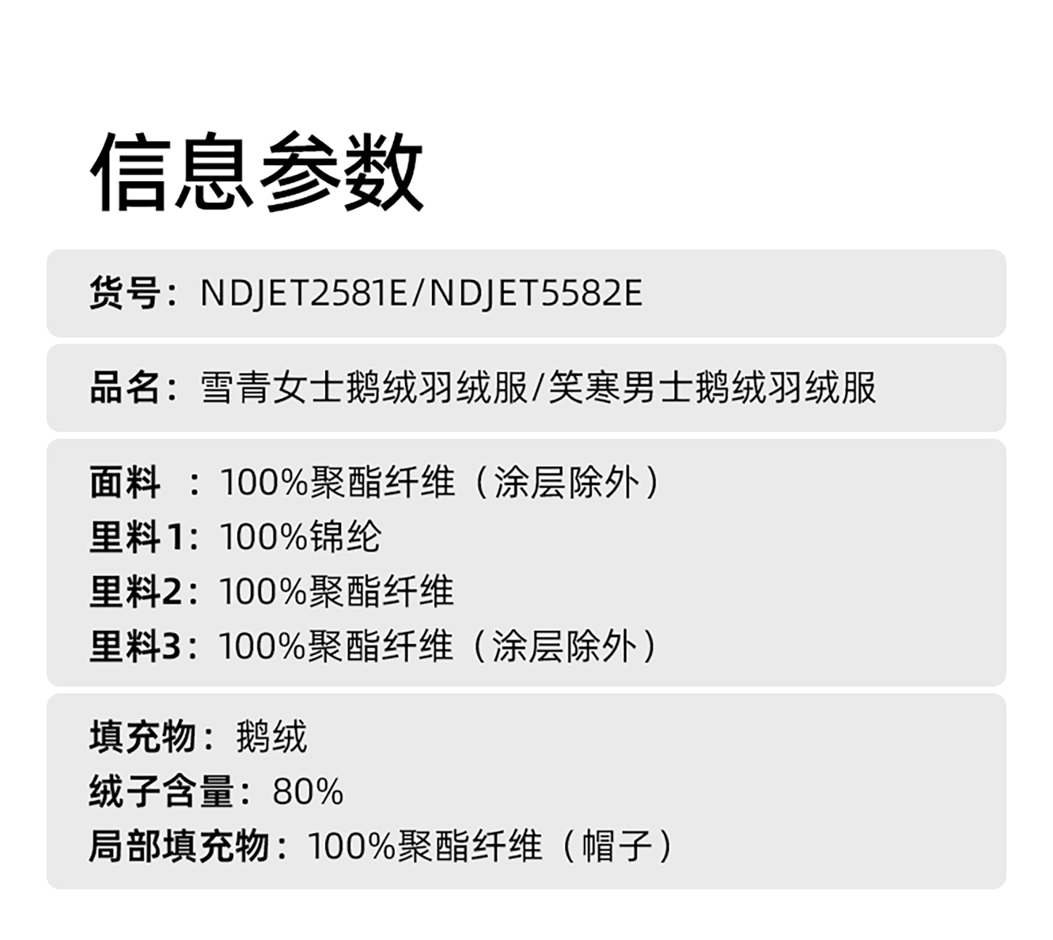 | 【面料成分】 面料100%聚酯纤维 里料100%锦纶 填充:80鹅绒 局部填充(帽子):100%聚酯纤维 |
