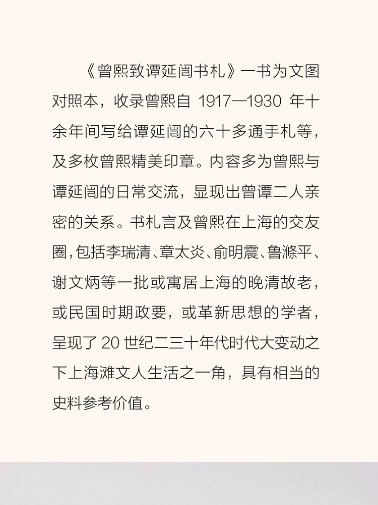 《曾熙致谭延闿书札》一书为文图对照本,收录曾熙自1917—1930年十余年间写给谭延闿的六十多通手札等,及多枚曾熙精美印章。内容多为曾熙与谭延闿的日常交流,显现出曾谭二人亲密的关系。书札言及曾熙在上海的交友圈,包括李瑞清、章太炎、俞明震、鲁滌平、谢文炳等一批或寓居上海的晚清故老,或民国时期政要,或革新思想的学者,呈现了二十世纪二三十年代时代大变动之下上海滩文人生活之一角。