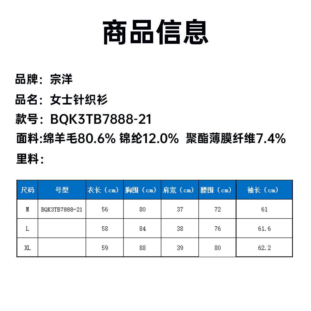 宗洋女士针织衫BQK3TB7888-21