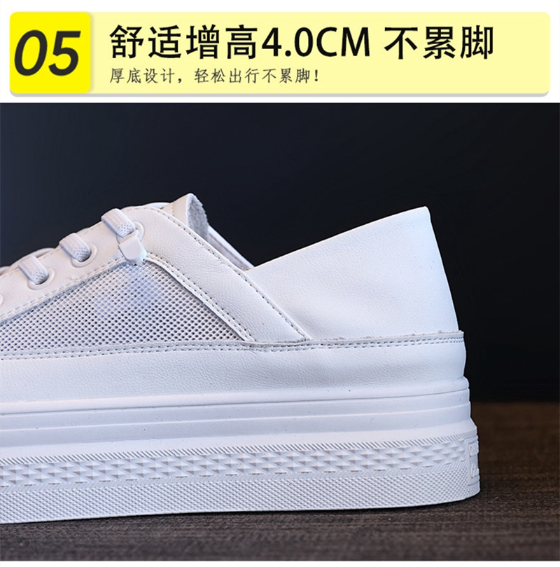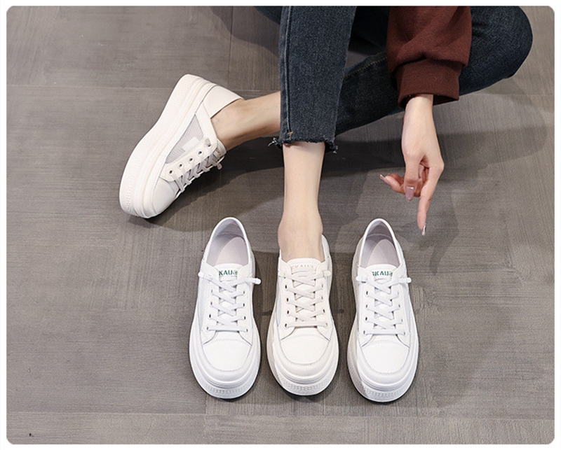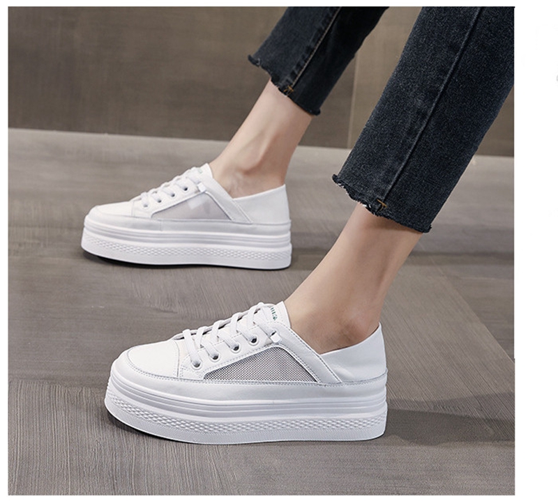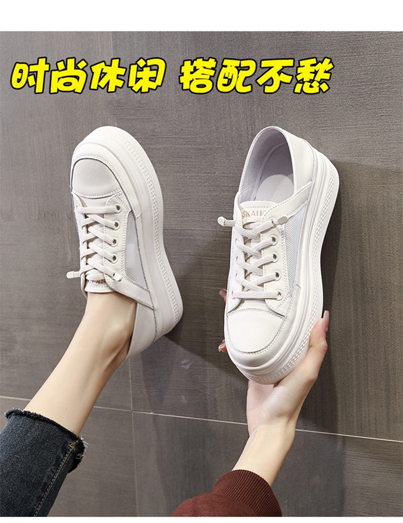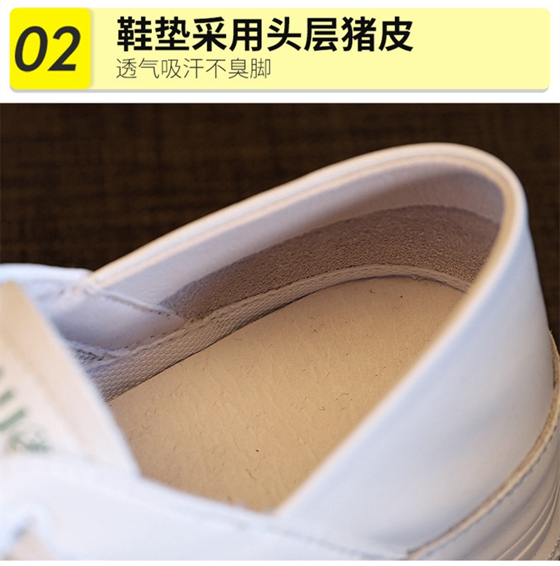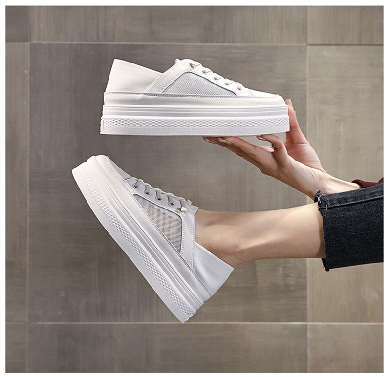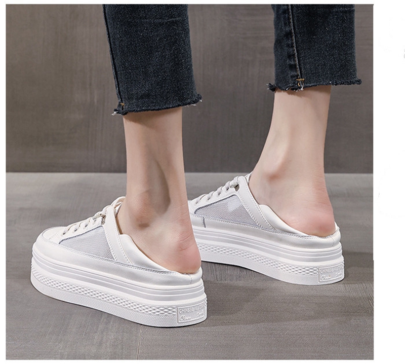 网面透气真皮圆头绑带平跟软底一脚蹬休闲板鞋
