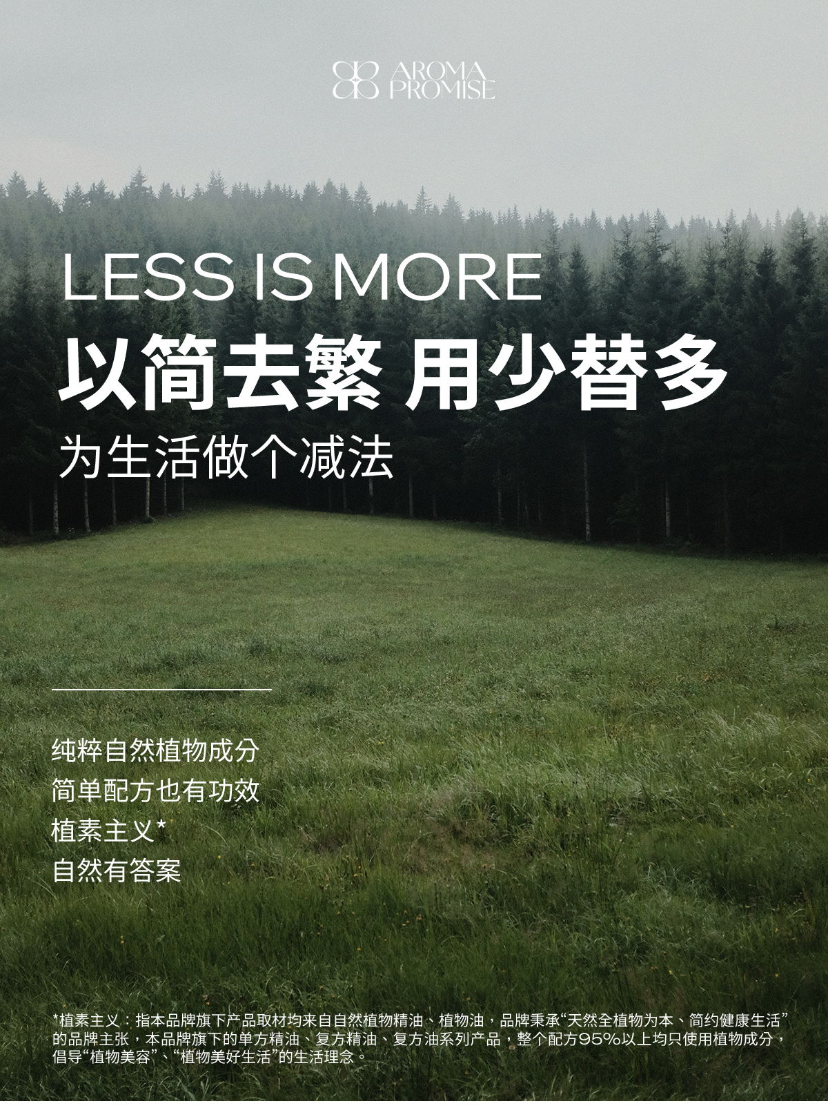 - Aroma Promise秉承自然平衡、疗愈和愉悦的产品理念,通过纯天然植物精油的力量,传递健康美好的生活方式,帮助您找到一片栖息和放松之地。