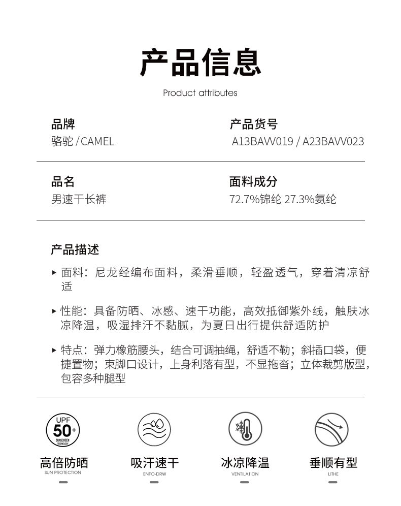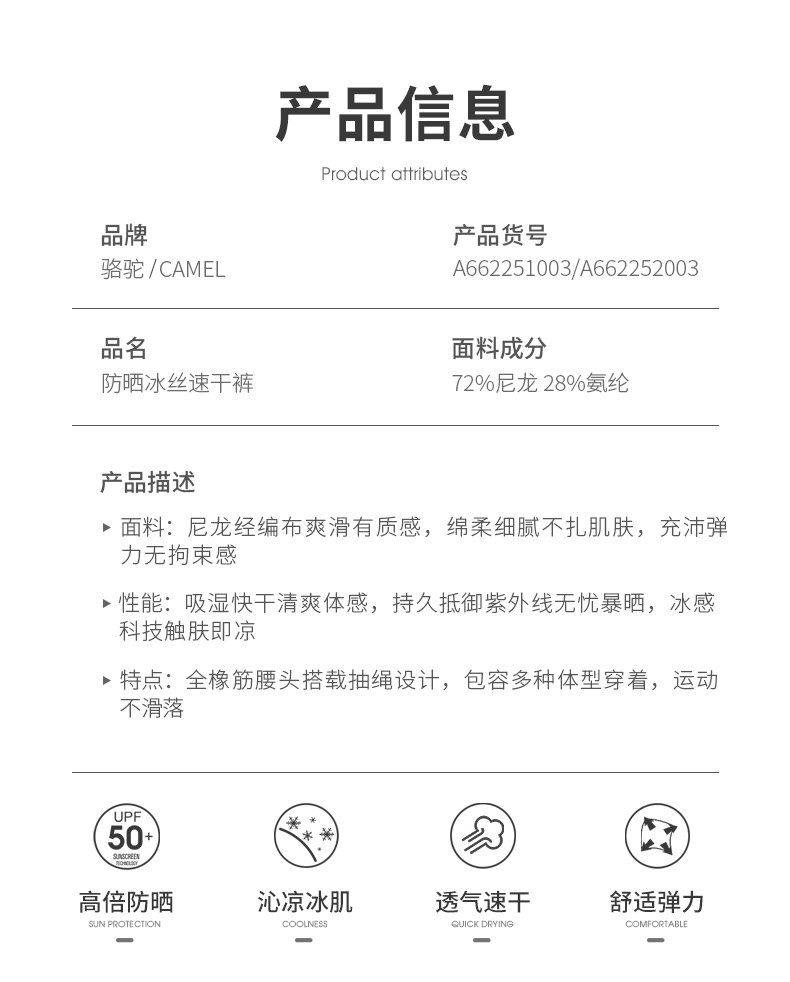 【冰感防晒】骆驼户外速干裤男女2025春夏高倍防晒UPF50+功能长裤 A23BAVV023_A13BAVV019