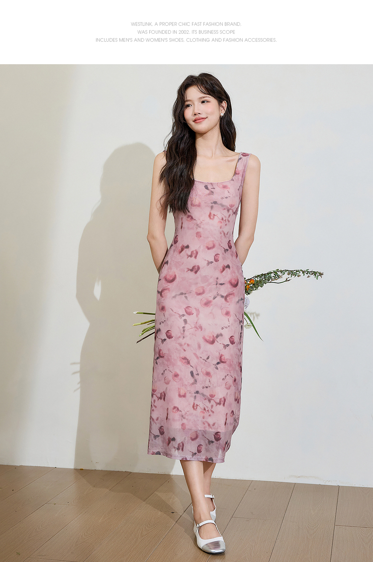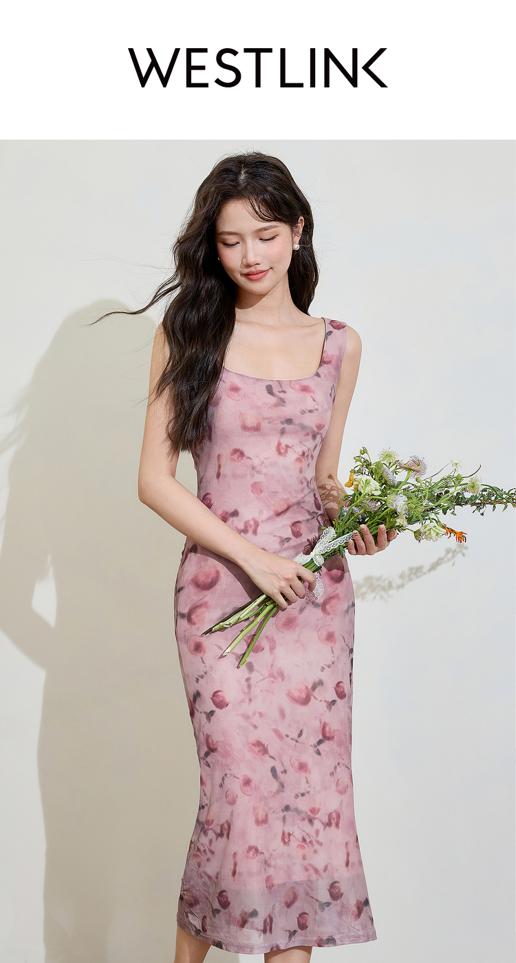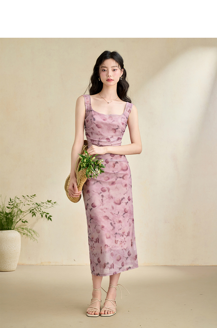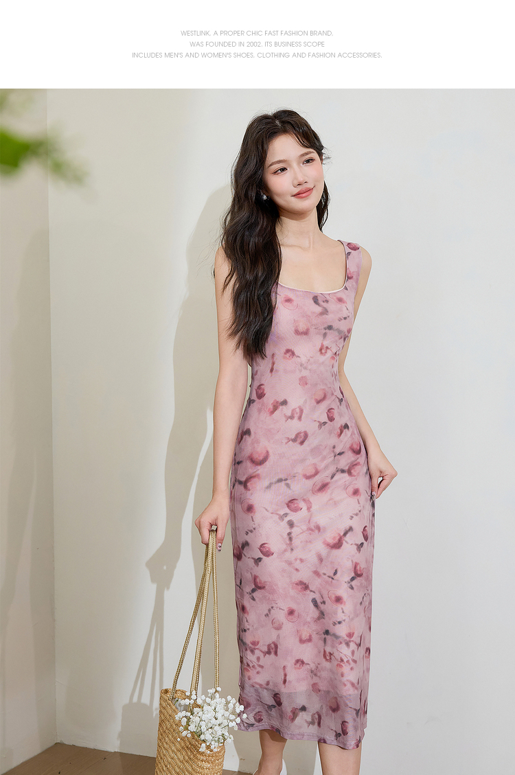 西遇背心连衣裙新款法式复古度假风方领碎花收腰无袖长裙P1341264