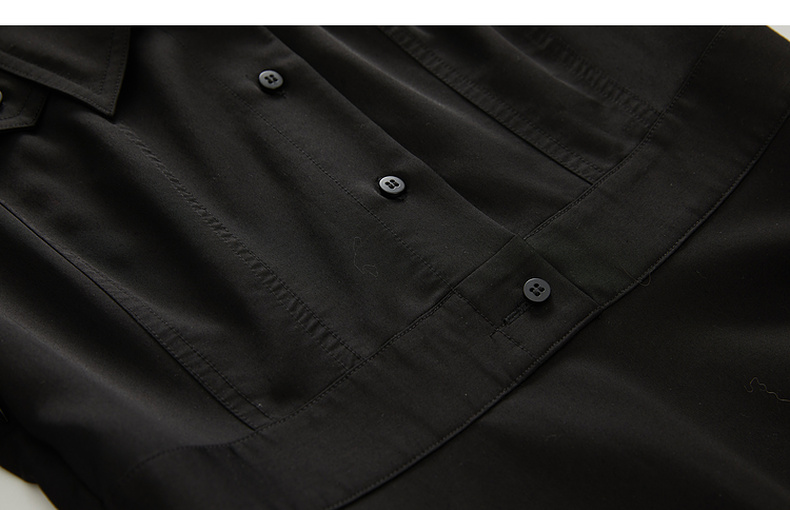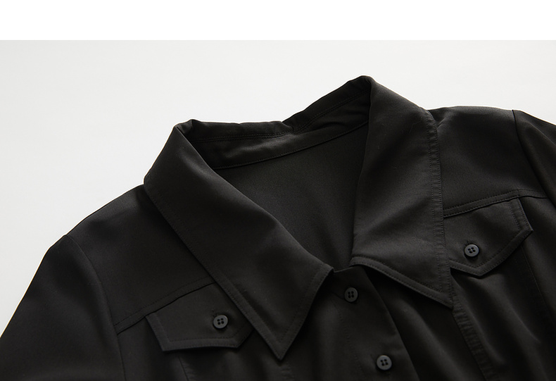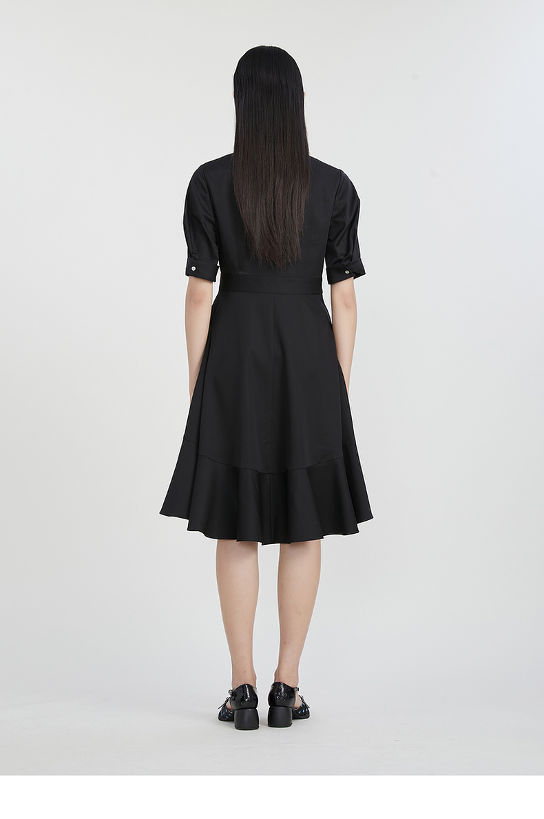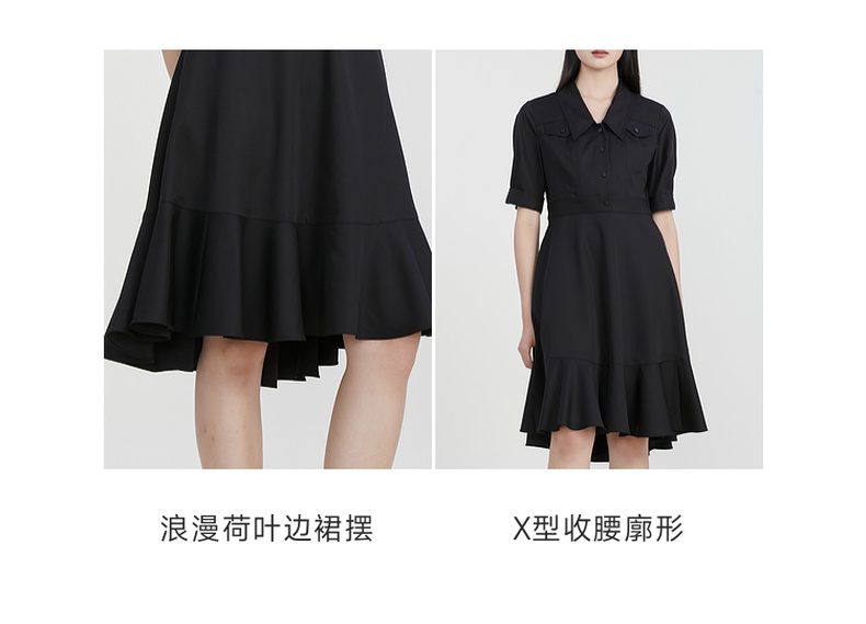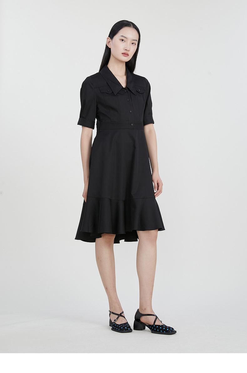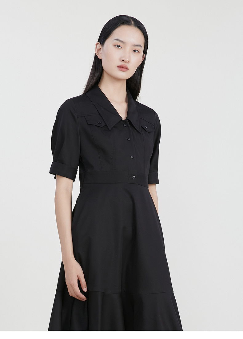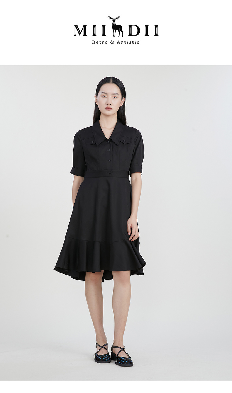 谜底纯色中长款连衣裙2023春季新款简约翻领中长裙短袖231ML0090