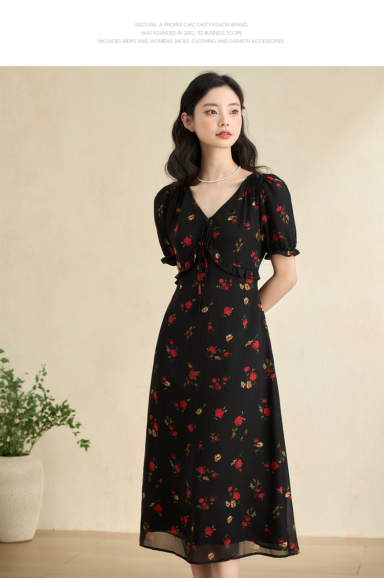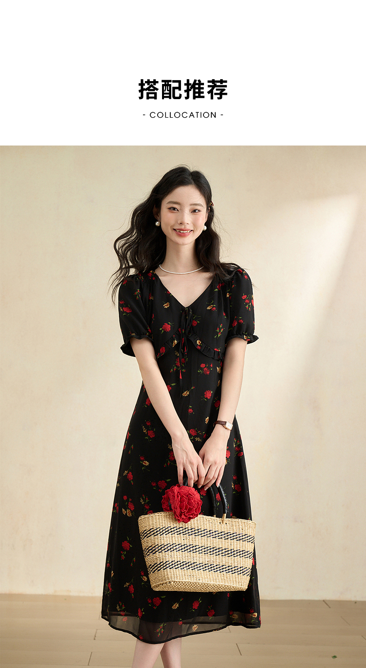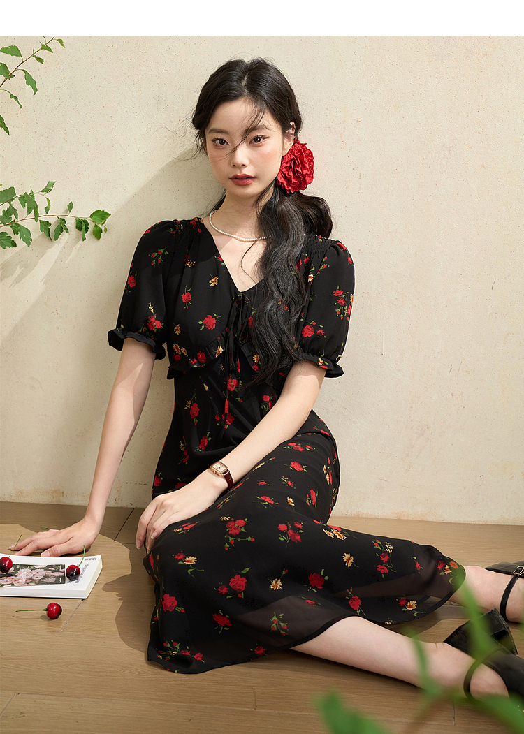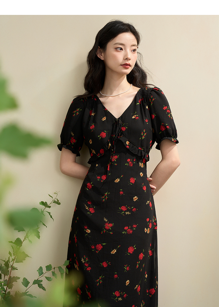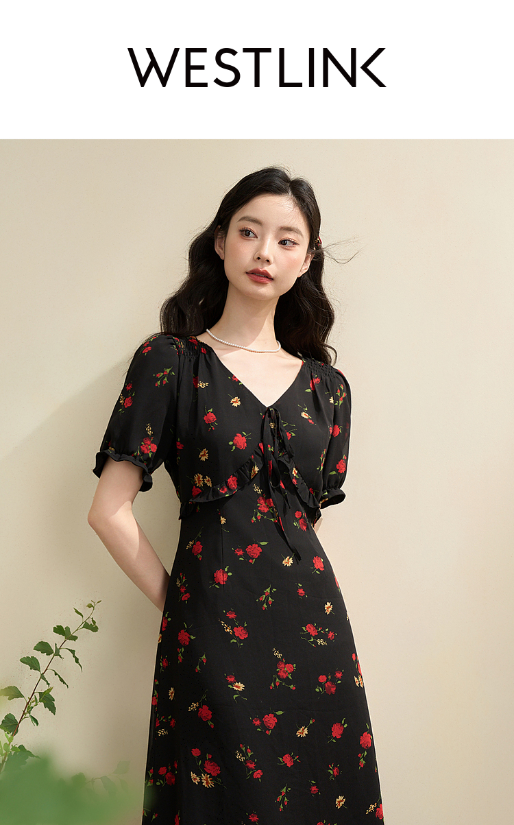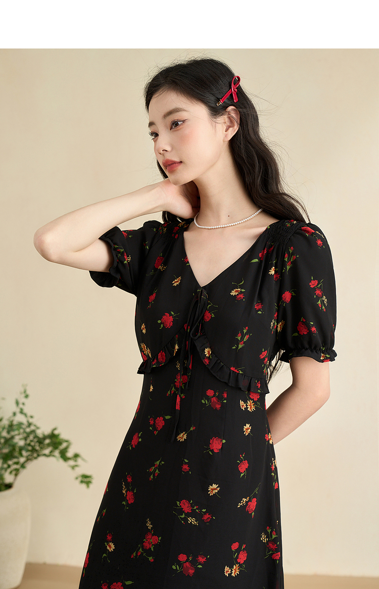 西遇法式V领黑红碎花连衣裙女早春新款复古浪漫时髦减龄裙子D2742211