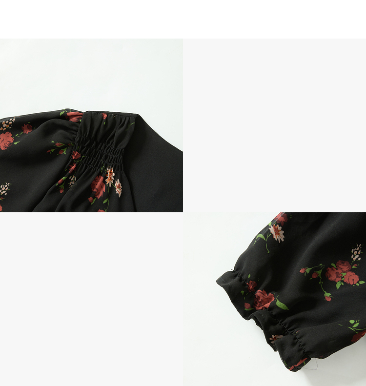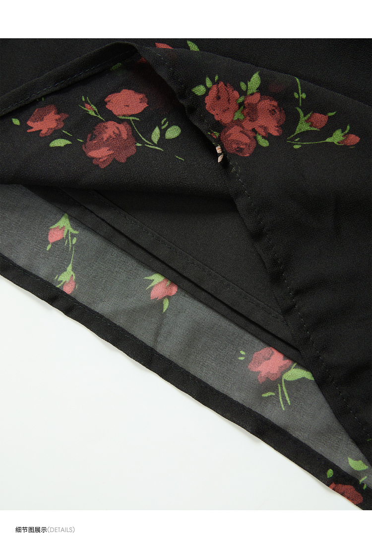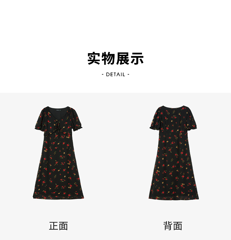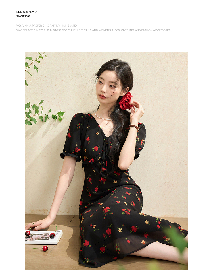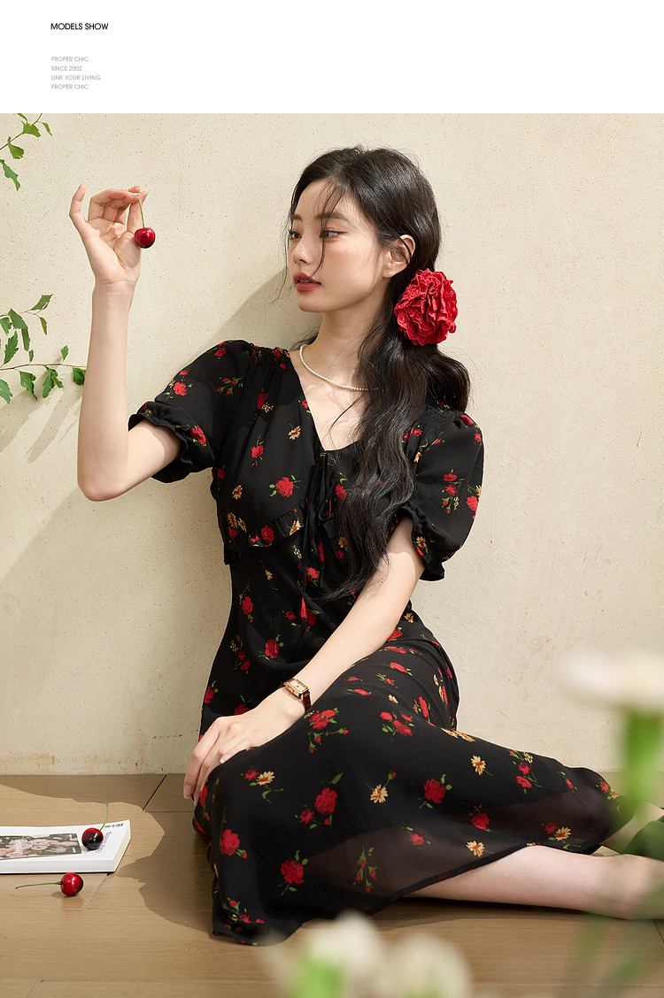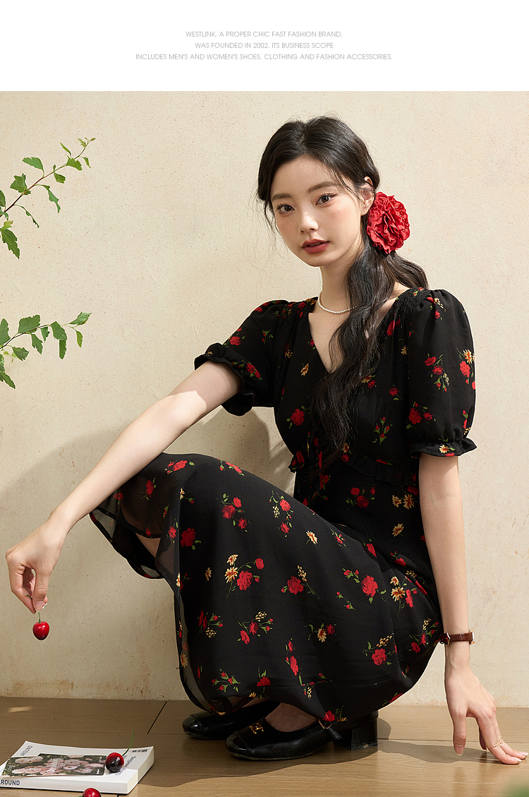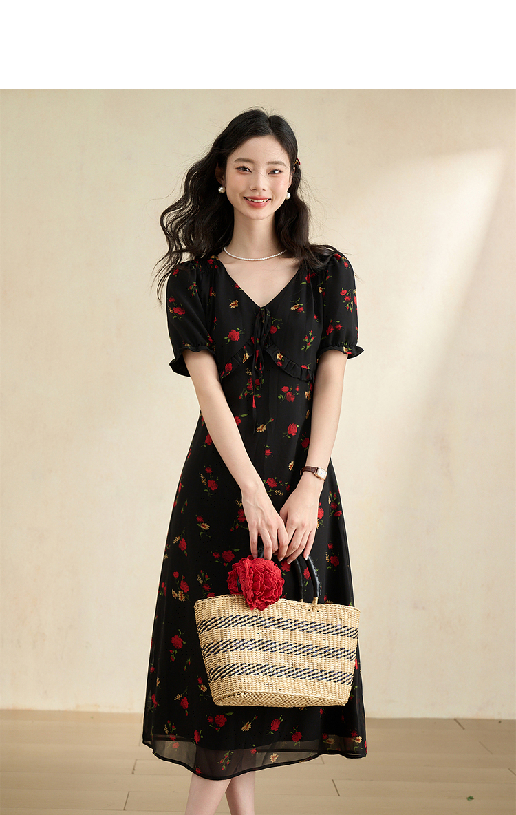 西遇法式V领黑红碎花连衣裙女早春新款复古浪漫时髦减龄裙子D2742211