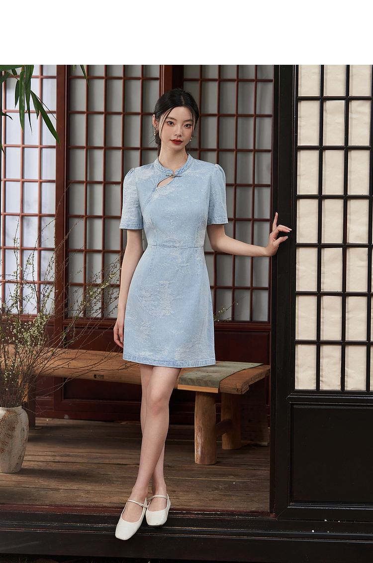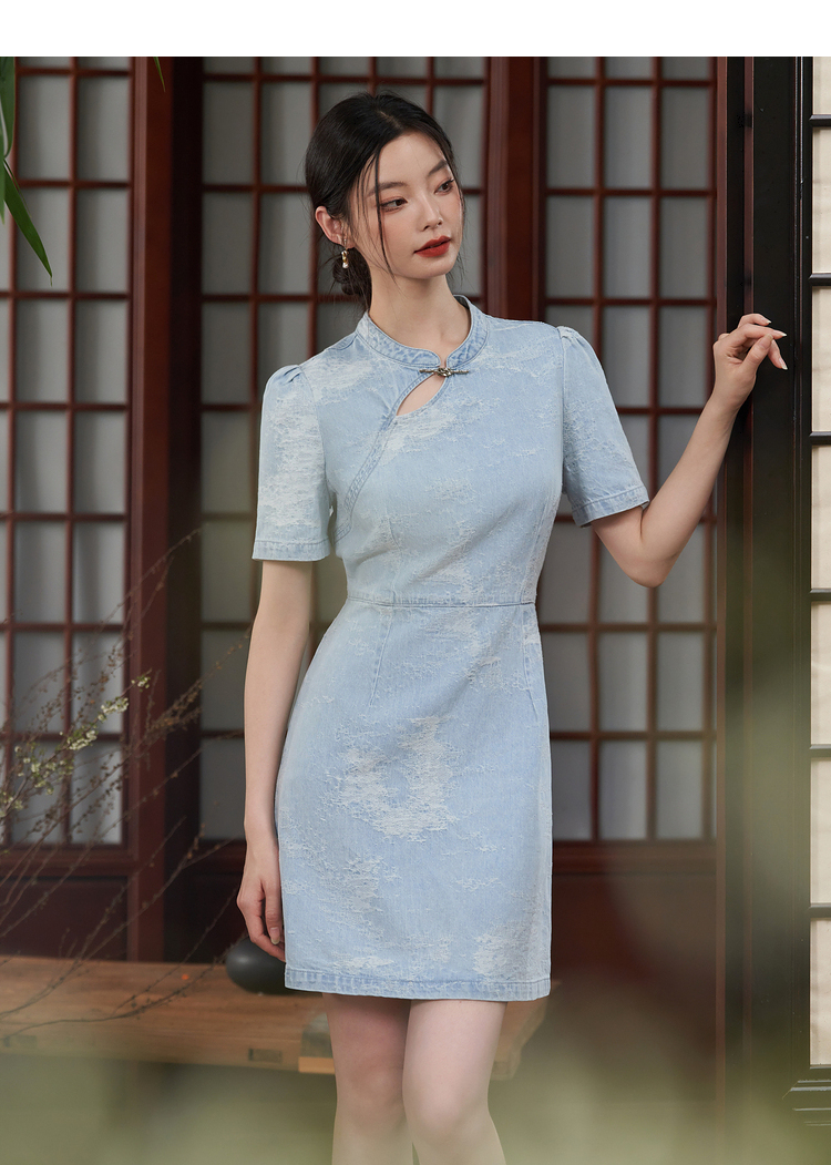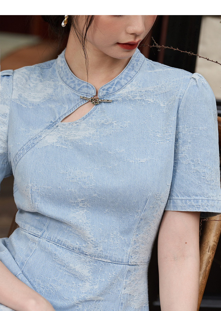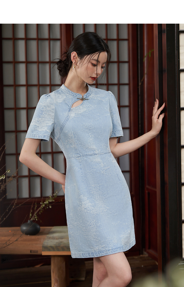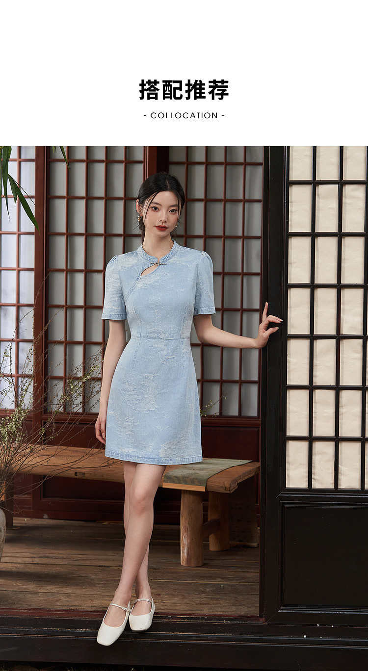 新中式国风旗袍立领提花牛仔连衣裙女夏季正肩收腰连衣裙V1541422