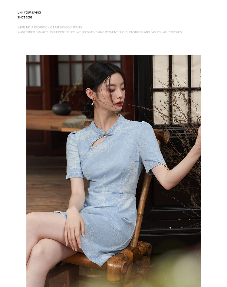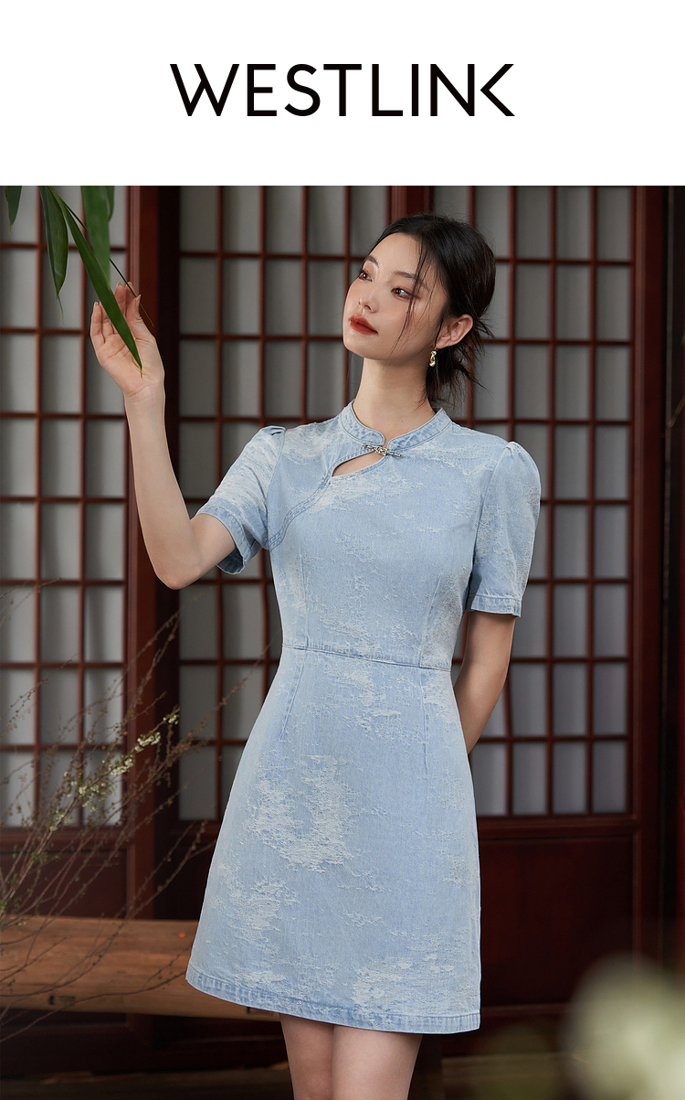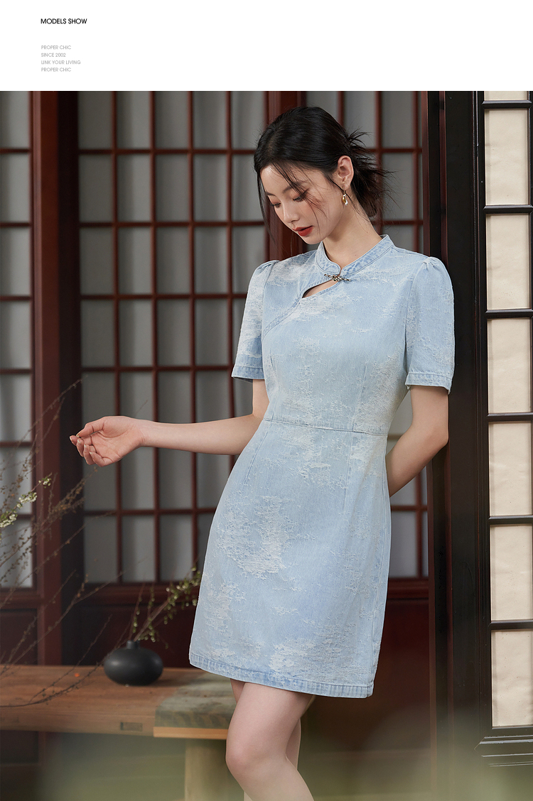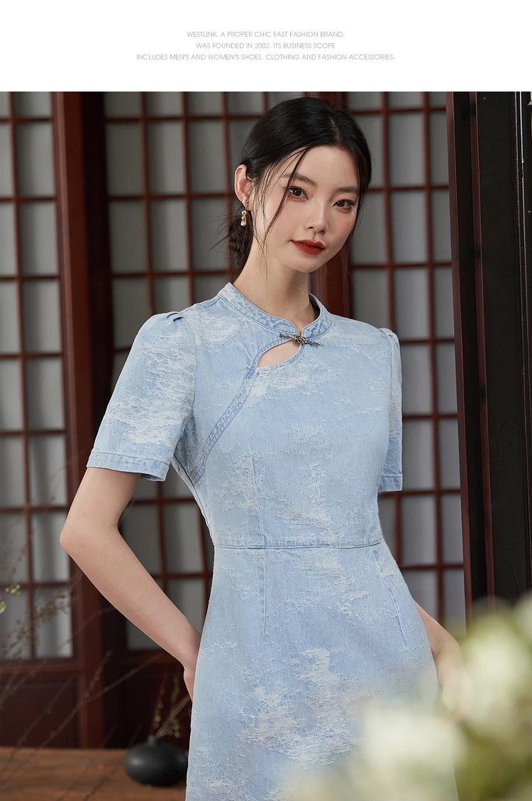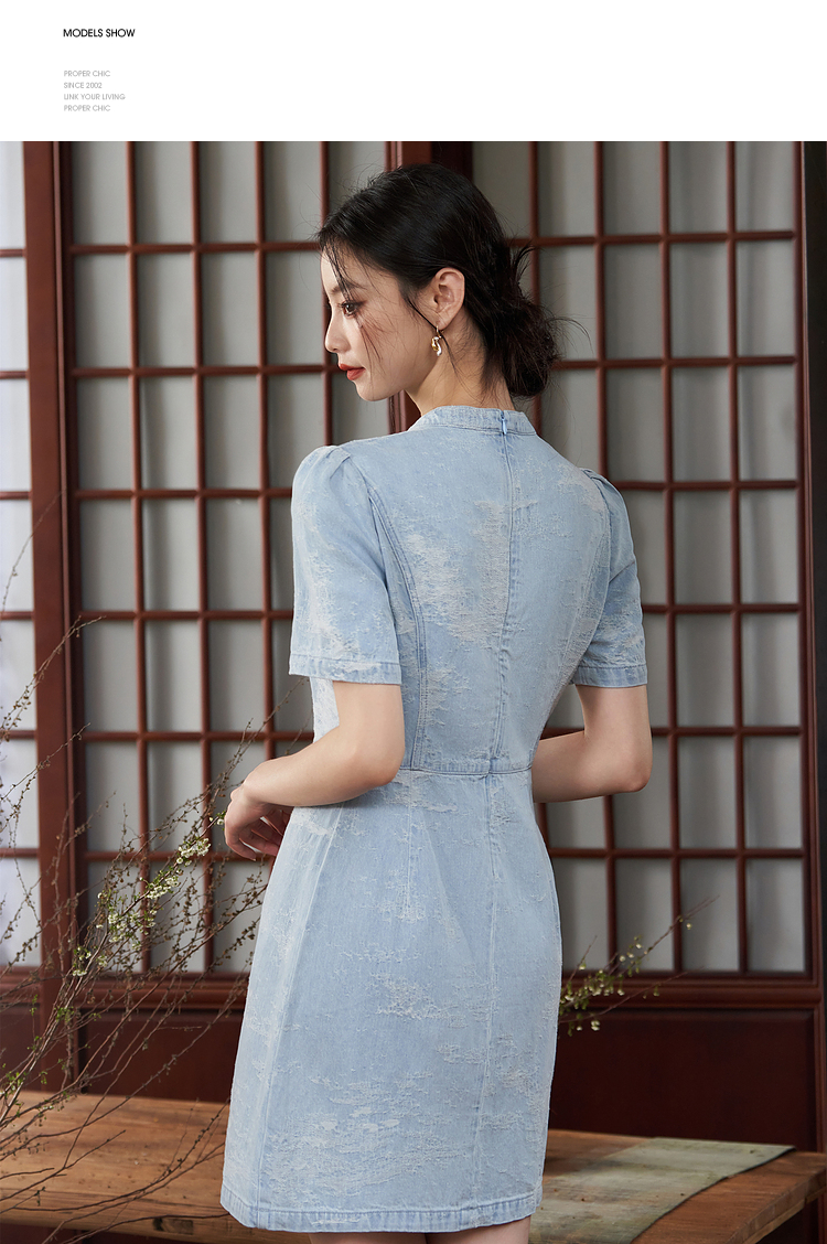 新中式国风旗袍立领提花牛仔连衣裙女夏季正肩收腰连衣裙V1541422