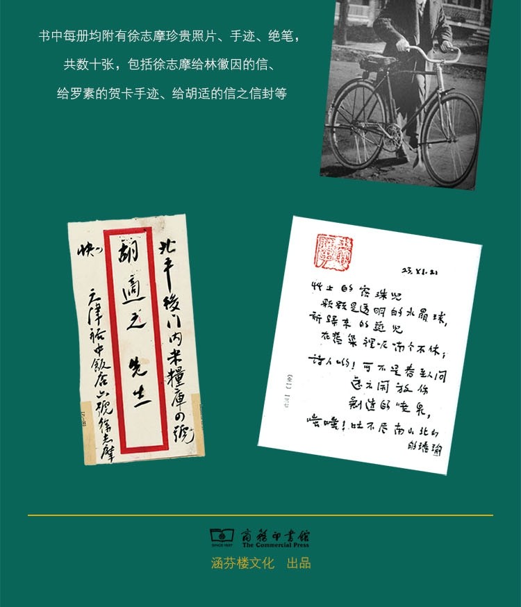 书中每册附有数十张徐志摩珍贵照片、手迹、绝笔,包括徐志摩给林徽因的信、给罗素的贺卡手迹、给胡适的信之信封等