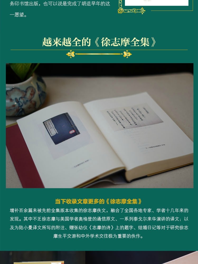 此套书系增补了近年来百余篇未被先前全集版本收集的徐志摩佚文,融合了全国各地专家、学者十几年来的发现。其中不乏徐志摩关于社会主义学说的论文、与美国学者奥格登的通信原文等对于研究徐志摩生平交游和中外学术交往极为重要的佚作,一系列泰戈尔来华演讲的译文;以及为陆小曼译文所写的附注,赠张幼仪《志摩的诗》上的题字;结婚日记等。