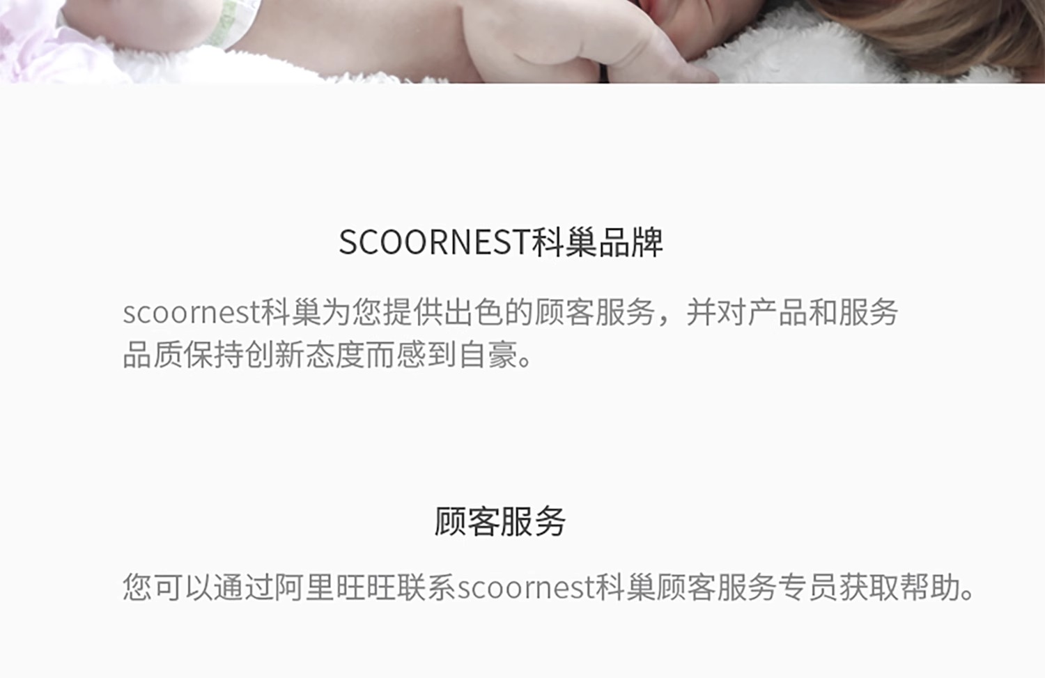 - Scoornest始终秉承给每一位宝宝送去科学的、关心的、创新的成长体验,通过提供商品和服务,使顾客形成守护、发展、巩固这种弥足珍贵的亲情的爱。