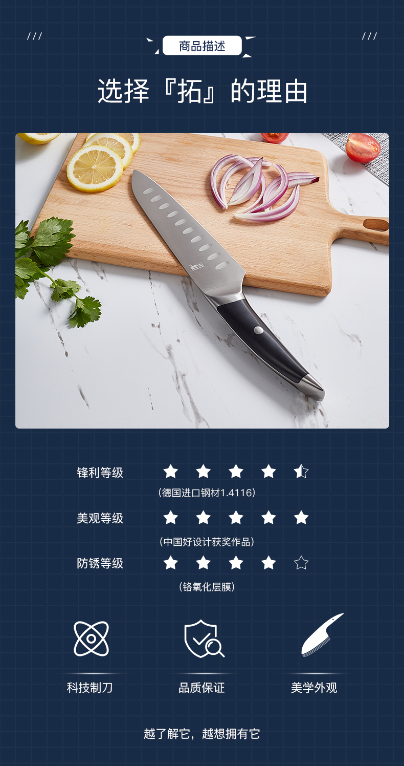 “拓”牌刀具为广东拓必拓科技股份有限公司旗下品牌,一直专注于研究、生产、销售专业厨房刀具,并与欧美、日本、台湾地区等多家知名品牌刀具进行合作,产品行销欧洲、美洲、日本等三十几个国家和地区。