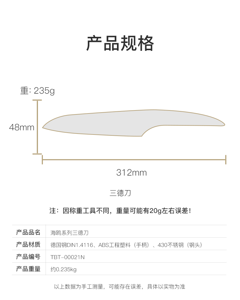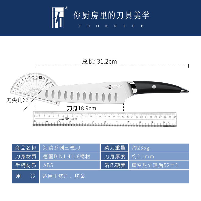 拓 海鸥三德刀家用防粘小菜刀不锈钢三德刀厨房菜刀西式多功能切肉厨刀