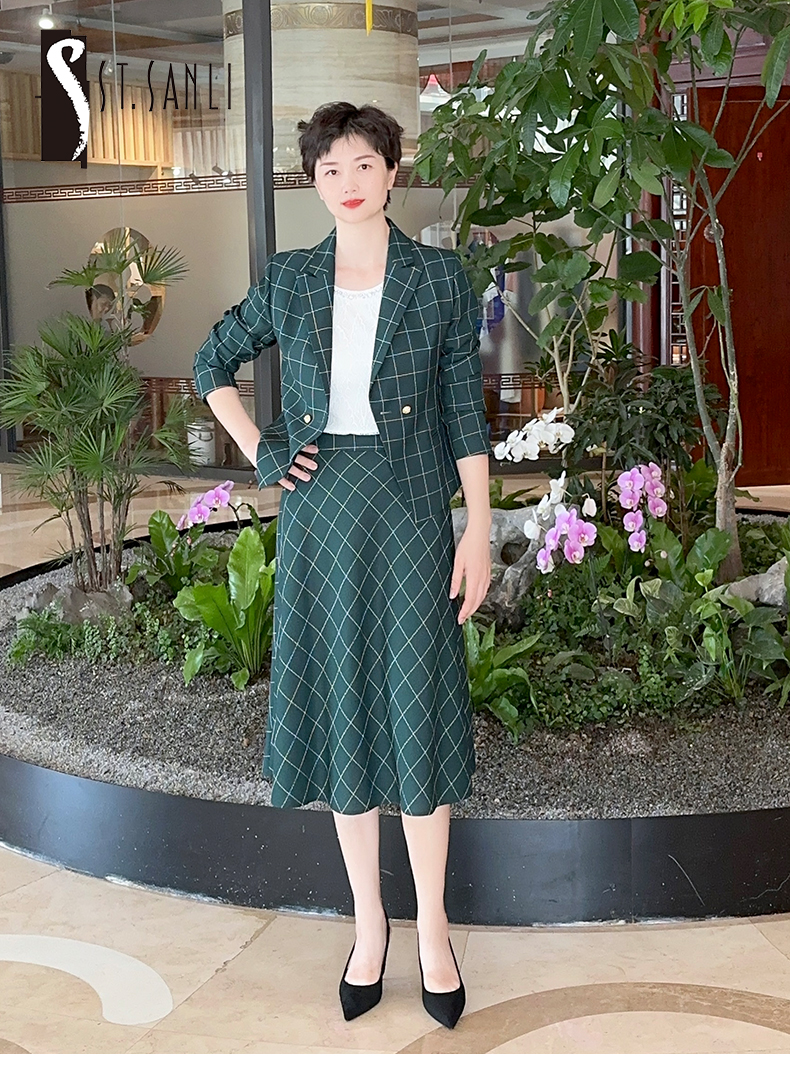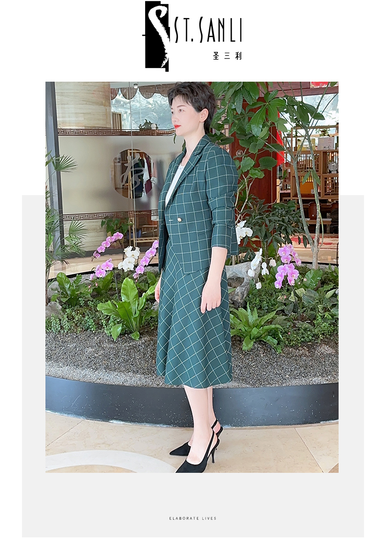 SAINT L’UCK/圣媛女装春季新款中长款V领格子连衣裙SA120L14