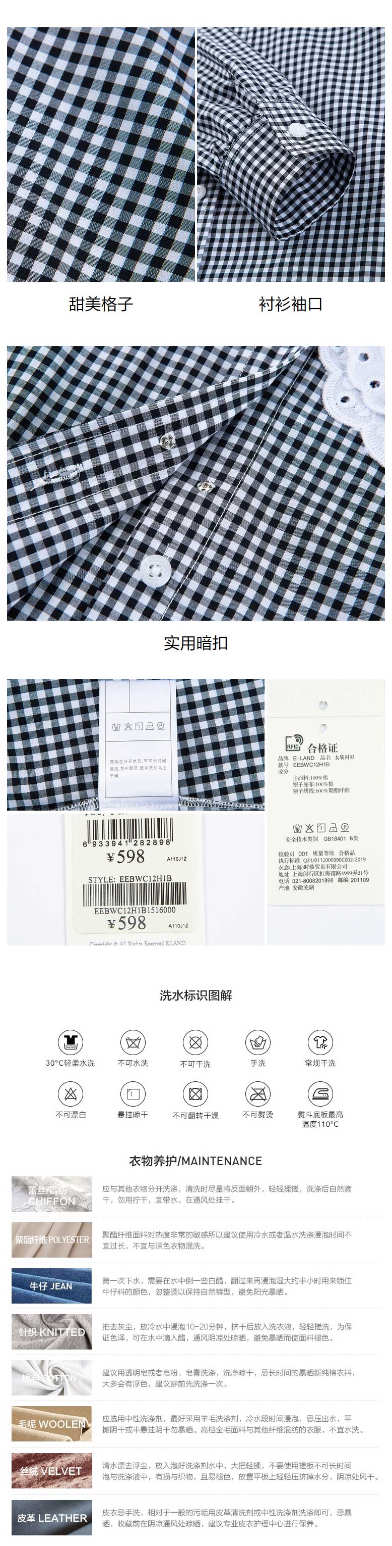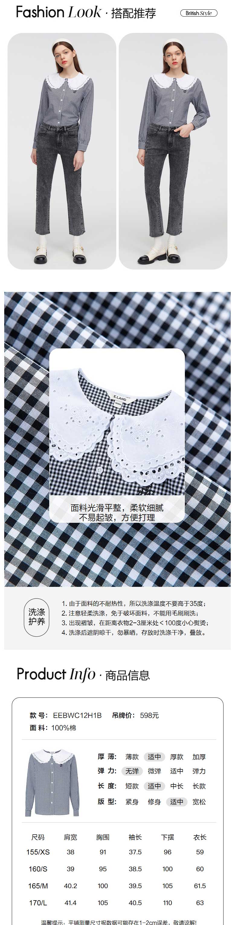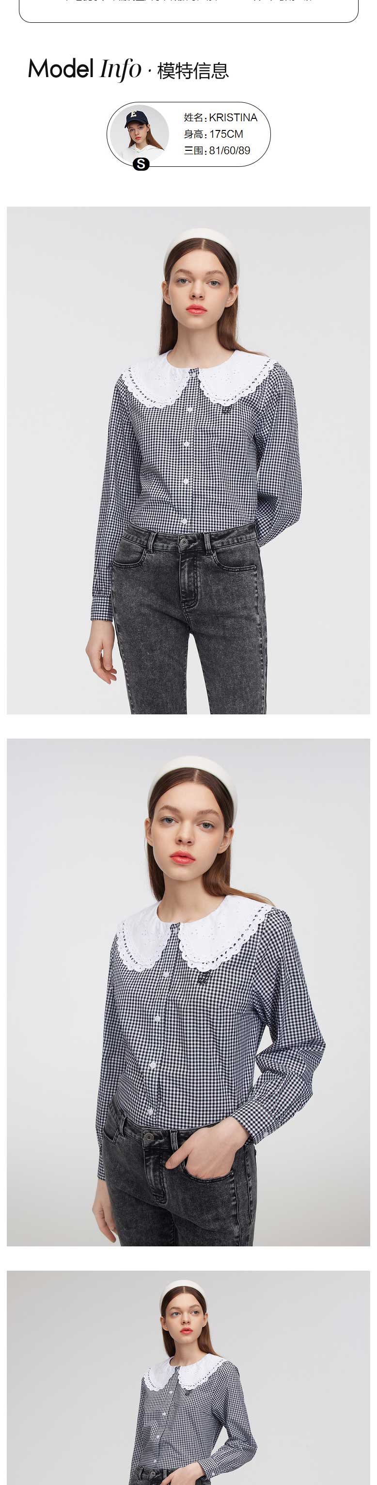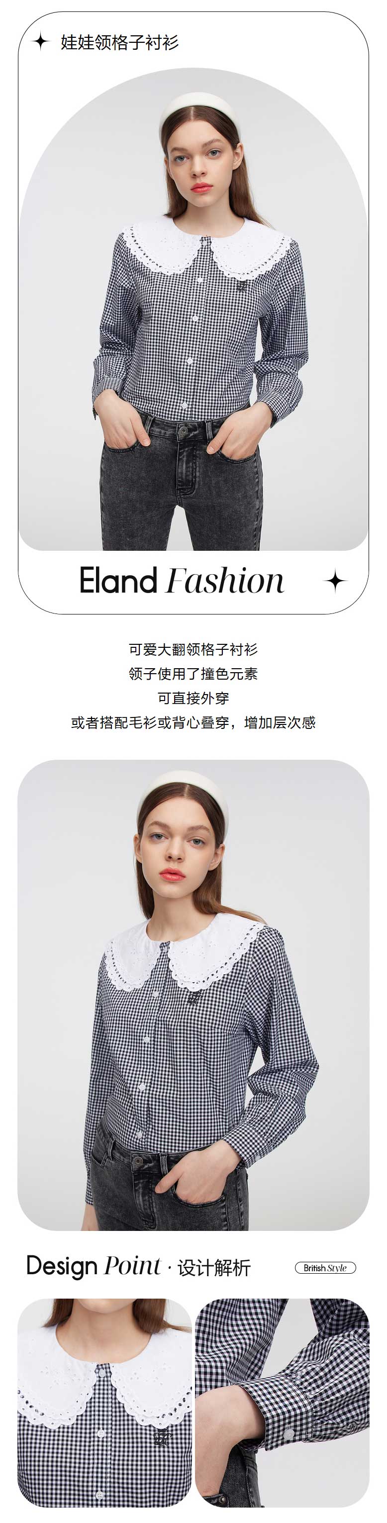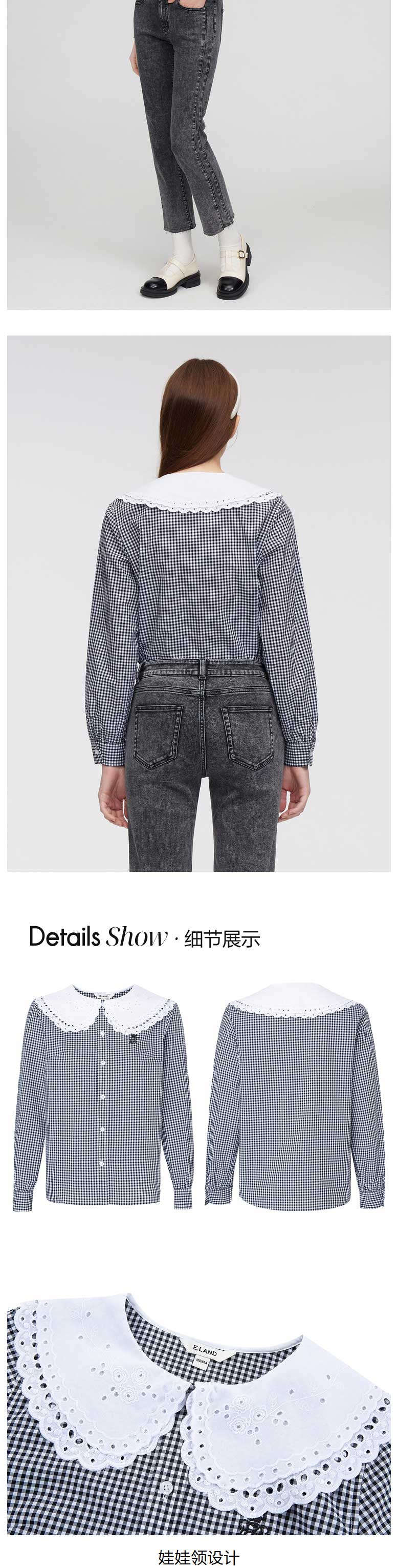 ELAND衣恋2022年春季新款小众设计感甜美花边领灰色格纹衬衫女EEBWC12H1B