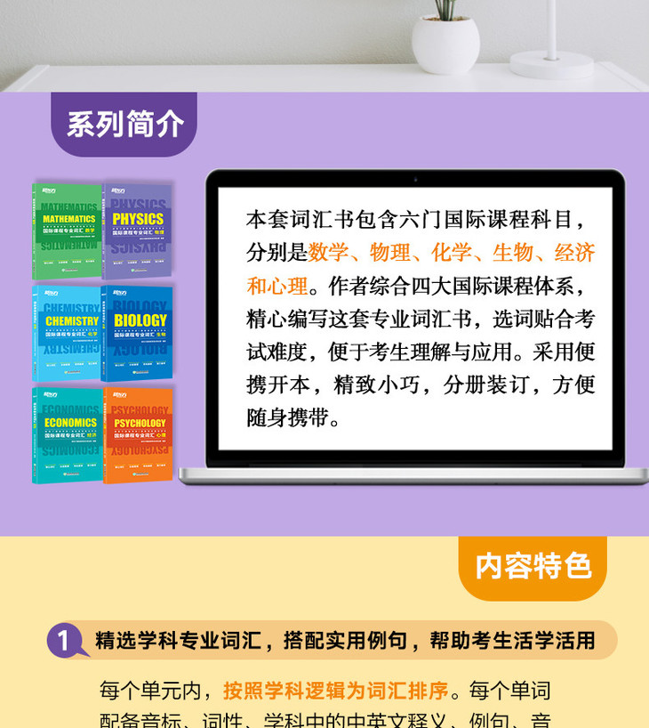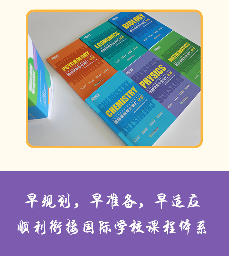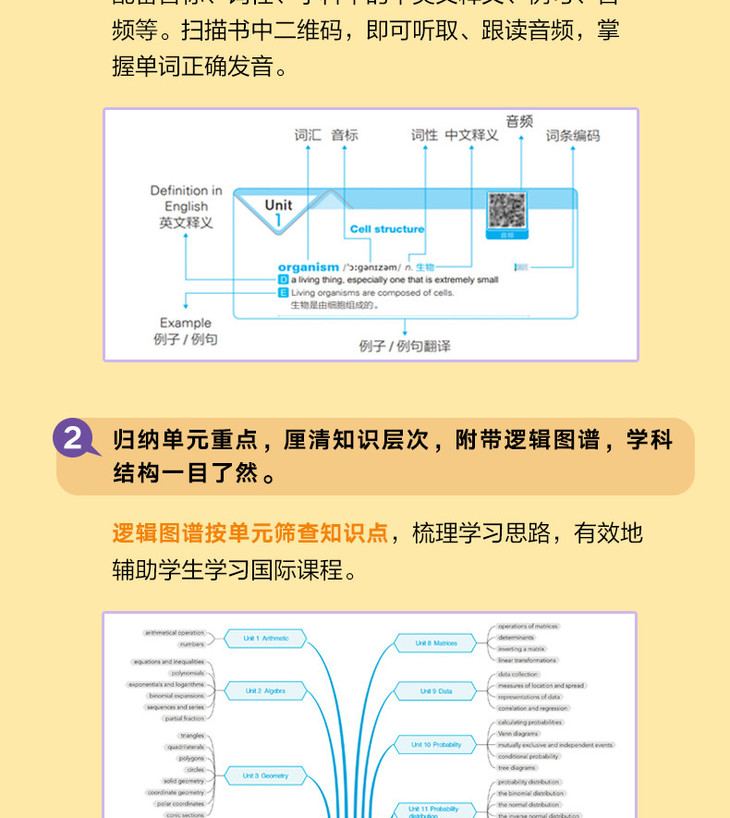 本套书是新东方老师基于四大国际课程体系编写而成的,适用于国际学校或国际班的初、高中学生。这套书包含6册,每册书采用相同的体例,每个词汇配有音标、词性、学科中的中英文释义及例句等,便于学生更好地理解词汇,掌握词汇用法,为国际考试打好基础。这套书的特色在于为每个科目提供了逻辑图谱,展示了每个单元的逻辑框架,通过这张图谱,同学们可以清晰地了解单元结构和重点内容,做到有针对性地备考。