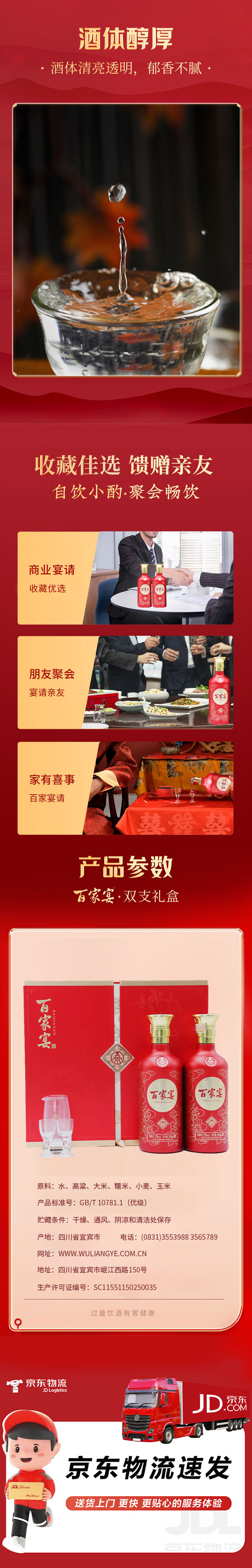 一价到底【五粮液百家宴红禧酒礼盒】绵柔醇厚香气浓郁,回甘清甜余韵悠长,大气礼盒彰显体面,2瓶仅需249元,还赠礼袋!