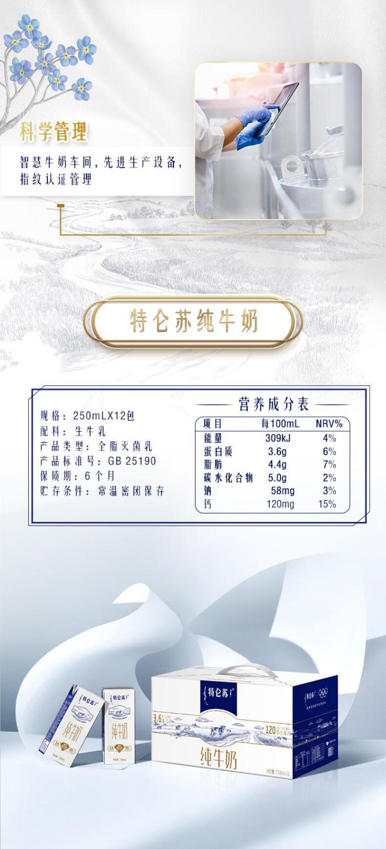 特仑苏3.6g优质蛋白120mg原生高钙 纯牛奶250ml*12瓶/箱