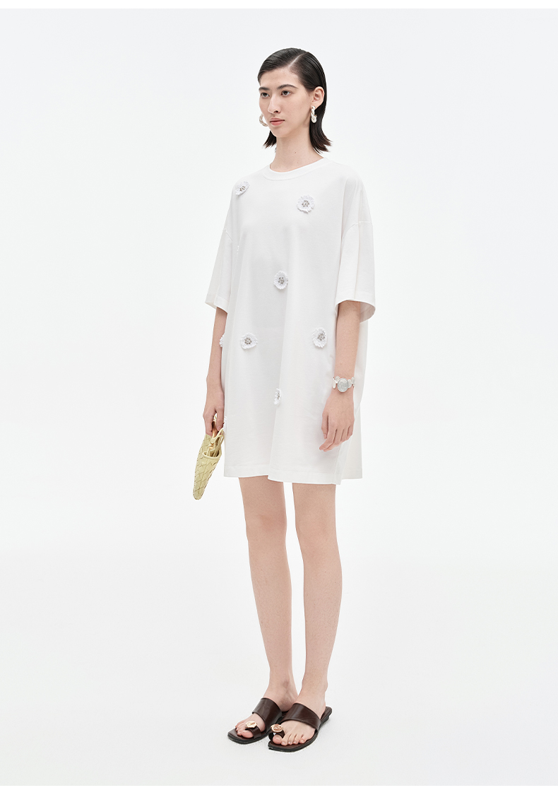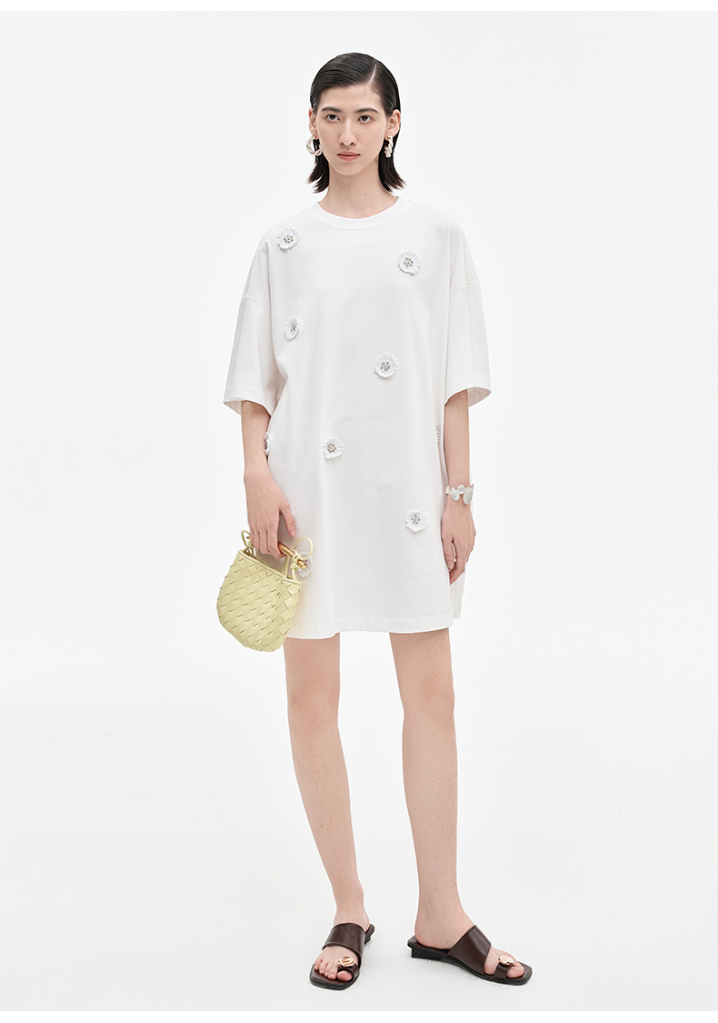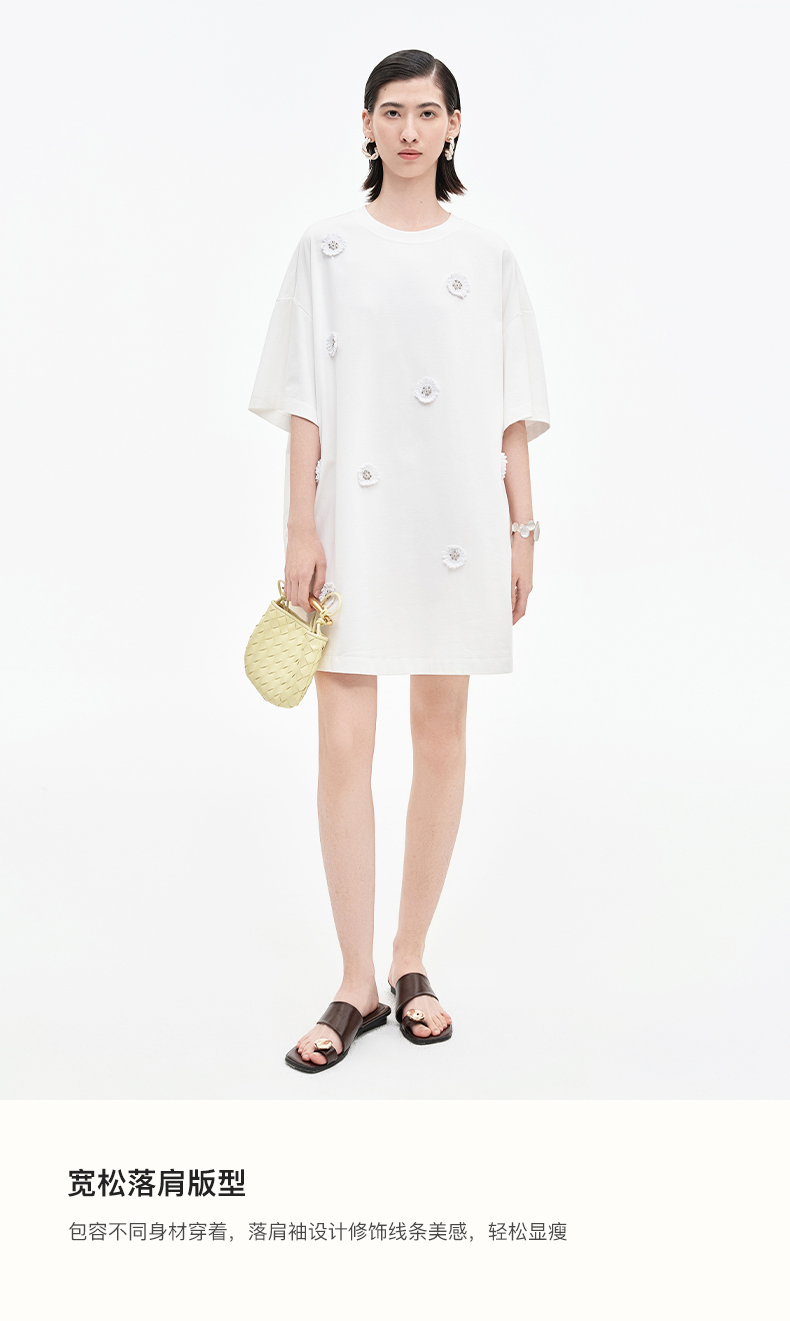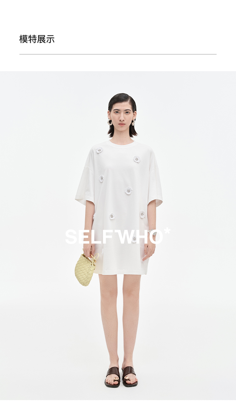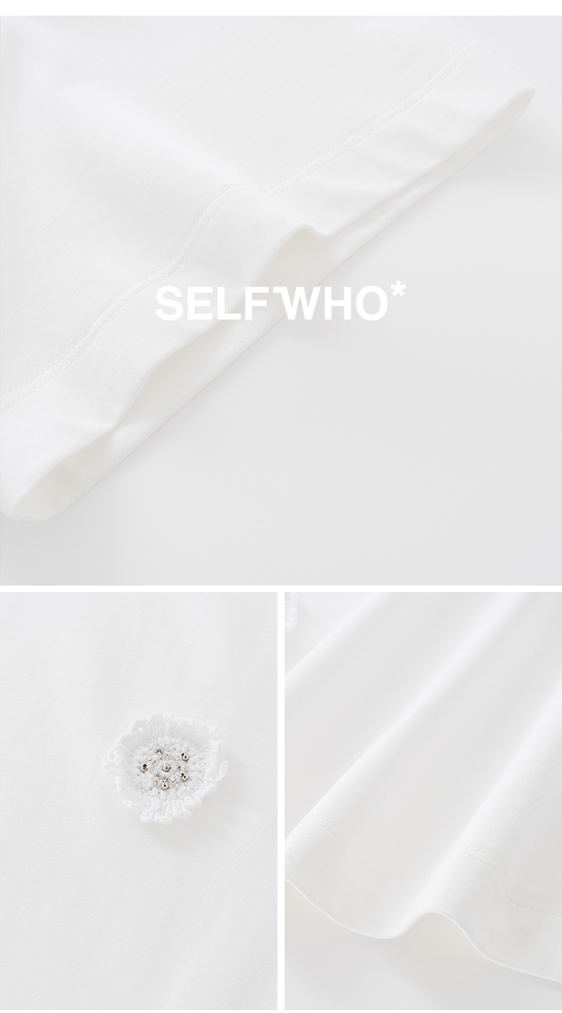 SELFWHO新疆精梳棉钩花钉珠连衣裙女2025夏新款宽松落肩两穿T恤裙