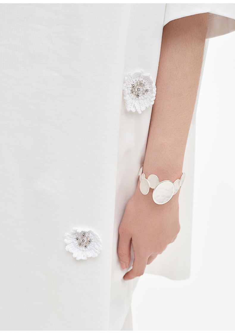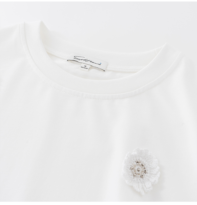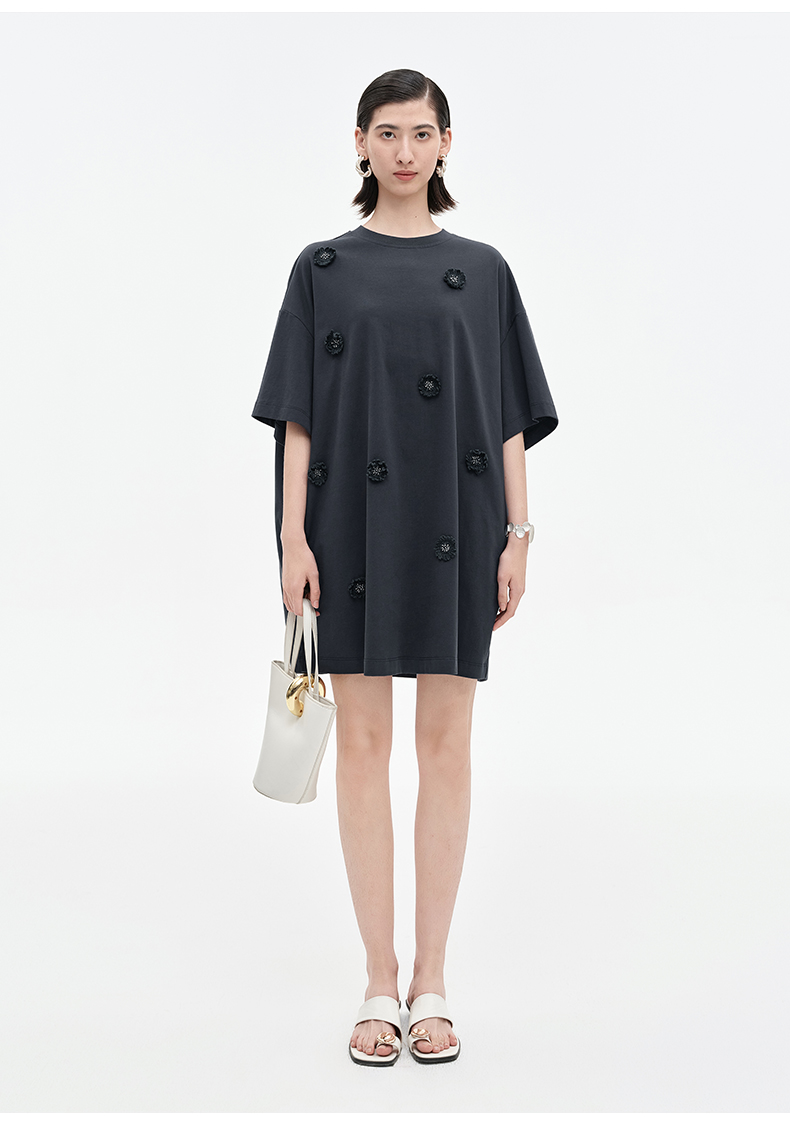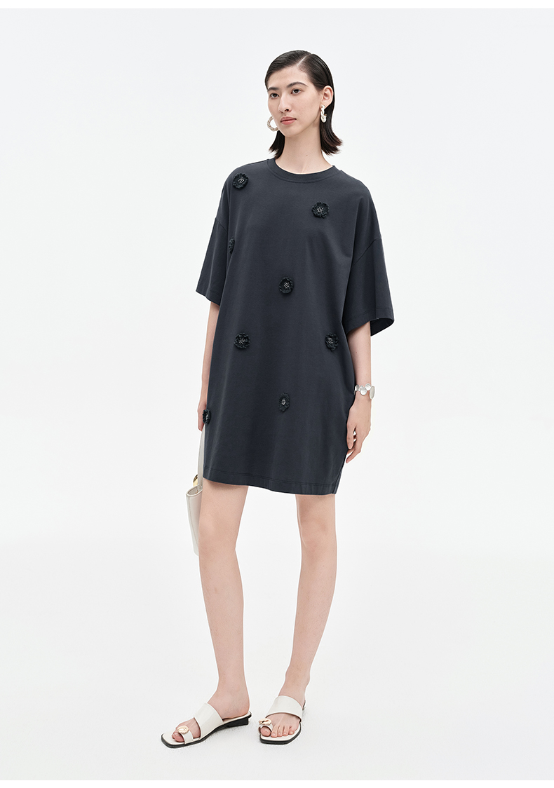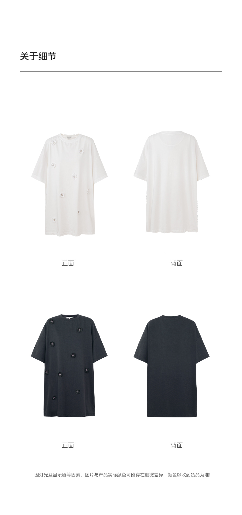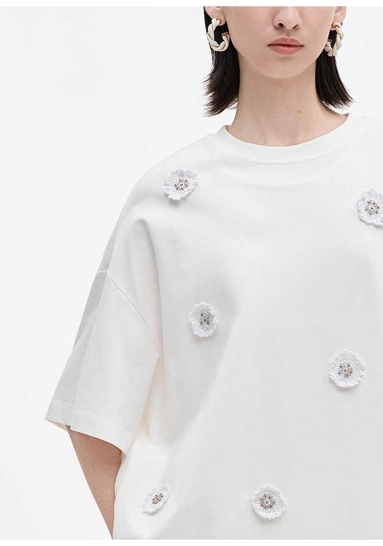 SELFWHO新疆精梳棉钩花钉珠连衣裙女2025夏新款宽松落肩两穿T恤裙
