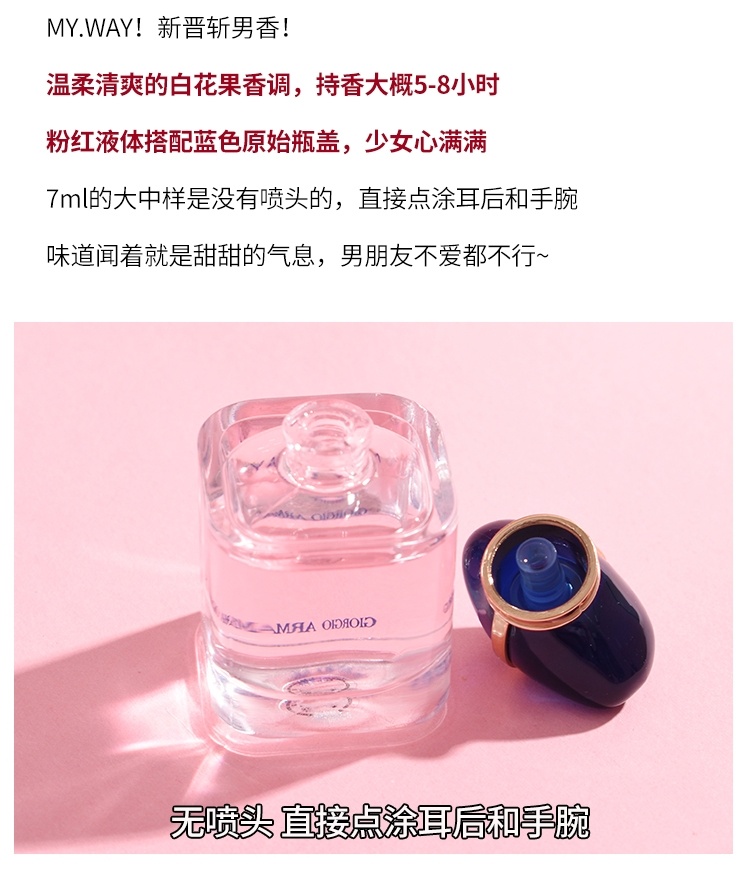 阿玛尼 myway 流沙版太仙啦!!尤其在阳光下或灯光下,珠光贝母混入粉色香水中闪着璀璨的光,难以抵抗的美~喷在皮肤上在阳光下看也会 blingbling 的~味道是充满活力的多肉葡萄还带些清新的茉莉花味儿,甜而不腻~