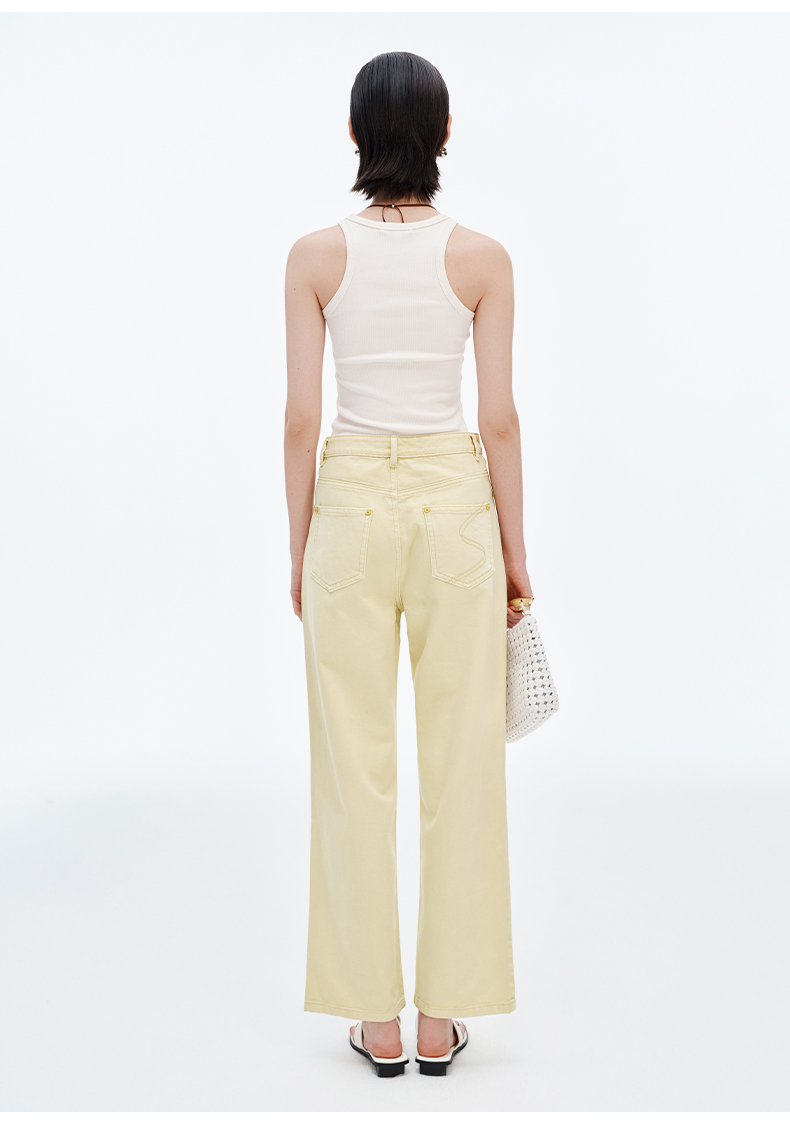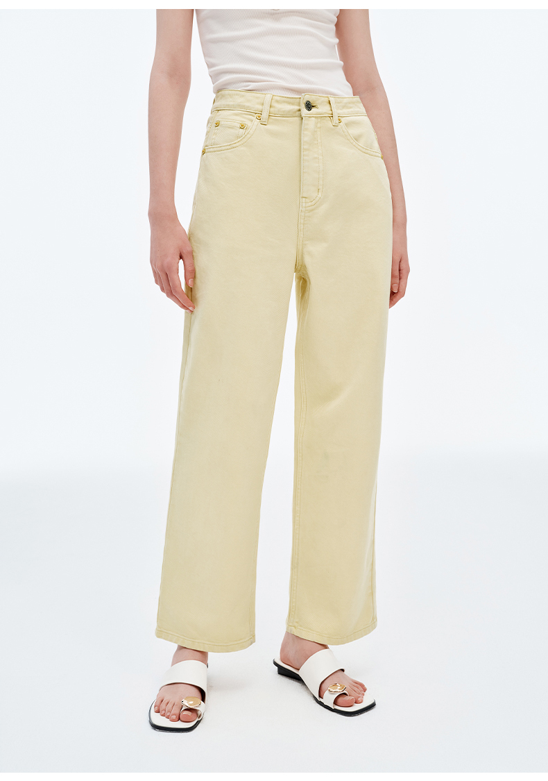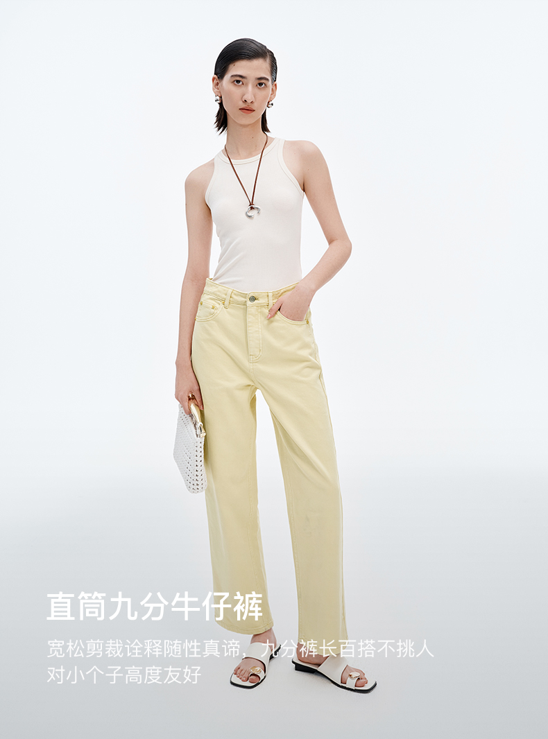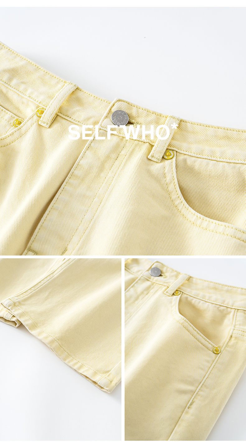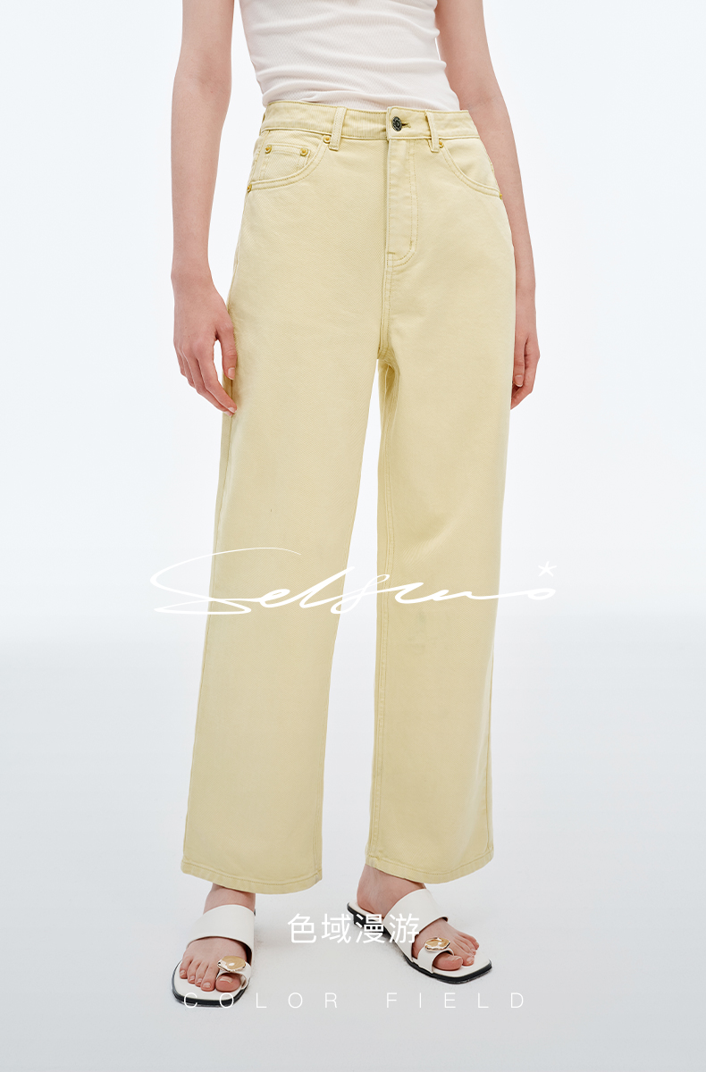 SELFWHO纯棉藤黄色水洗牛仔裤女2025夏新款时髦清新直筒九分裤