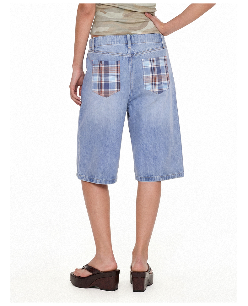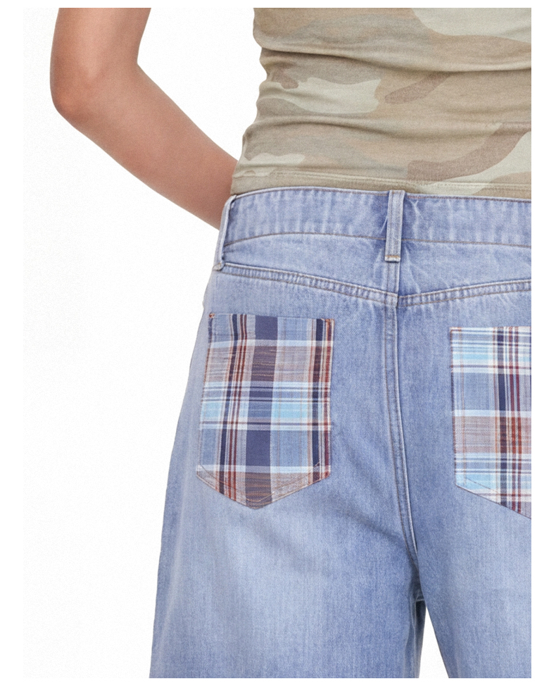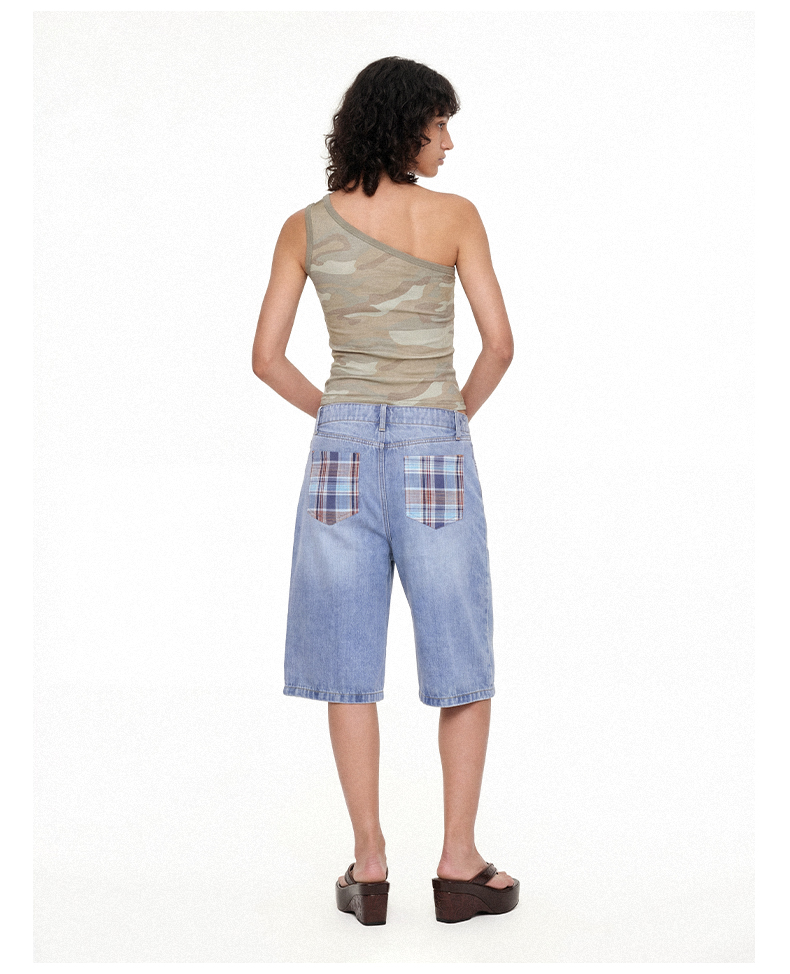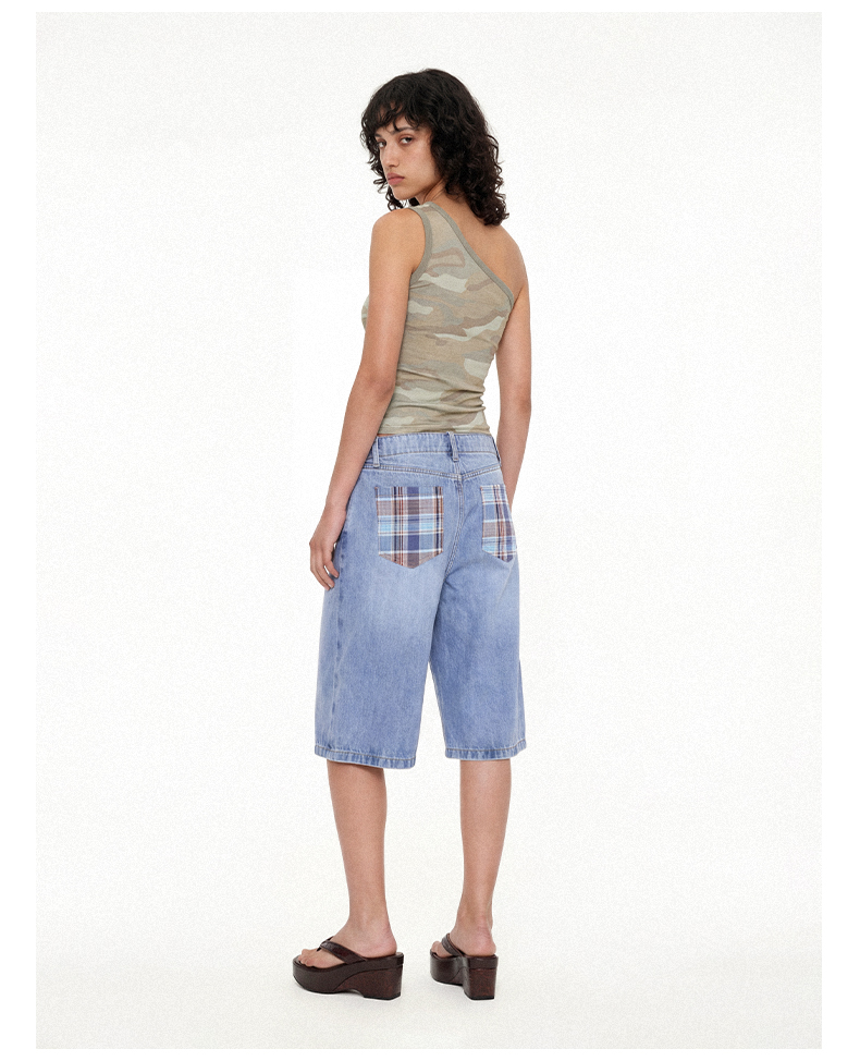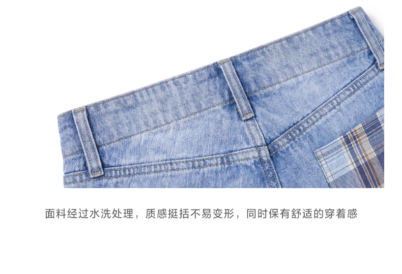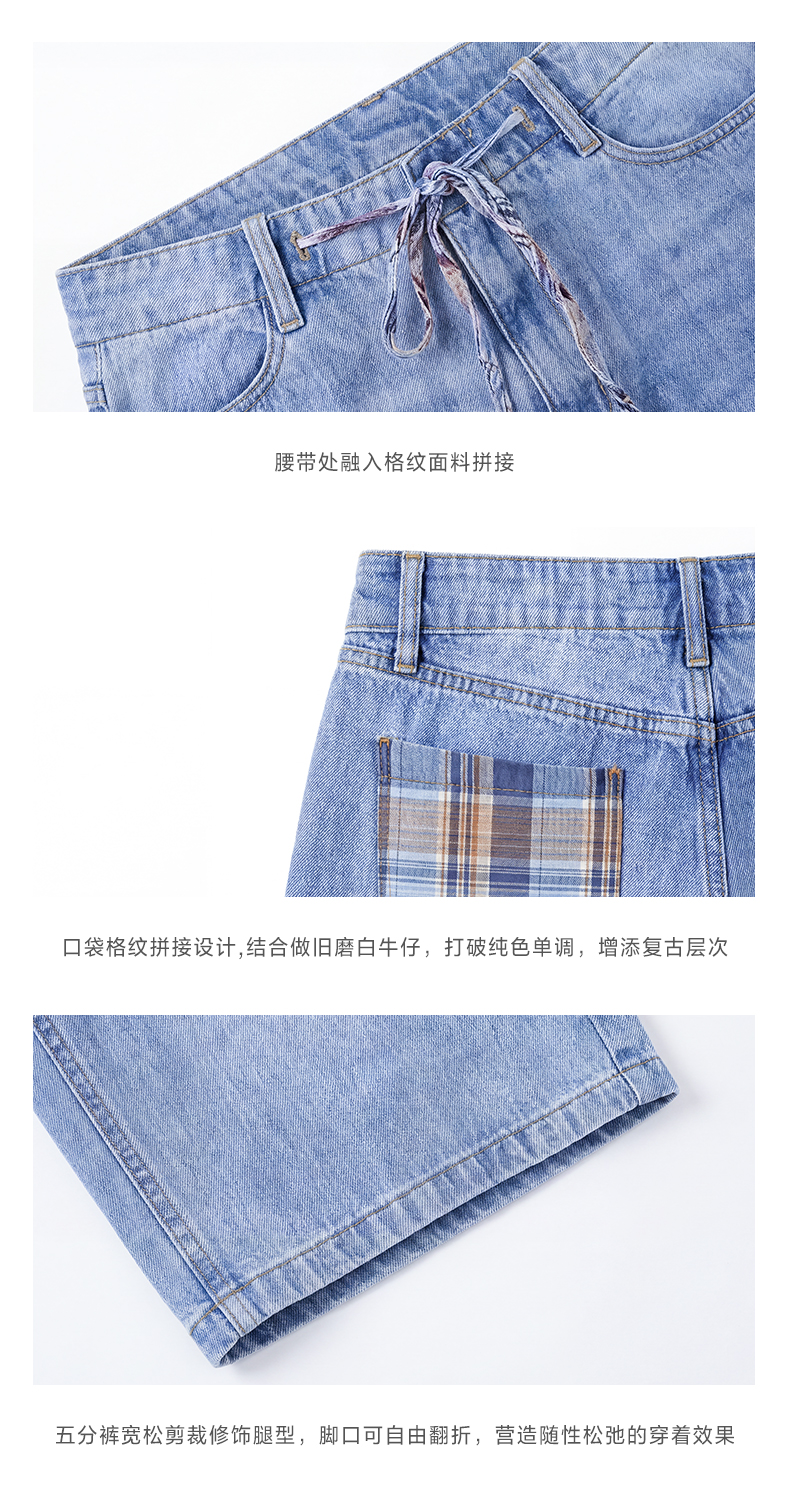 NUTH格纹拼接复古蓝色水洗牛仔中裤五分裤女(预售/发货时间同步天猫)