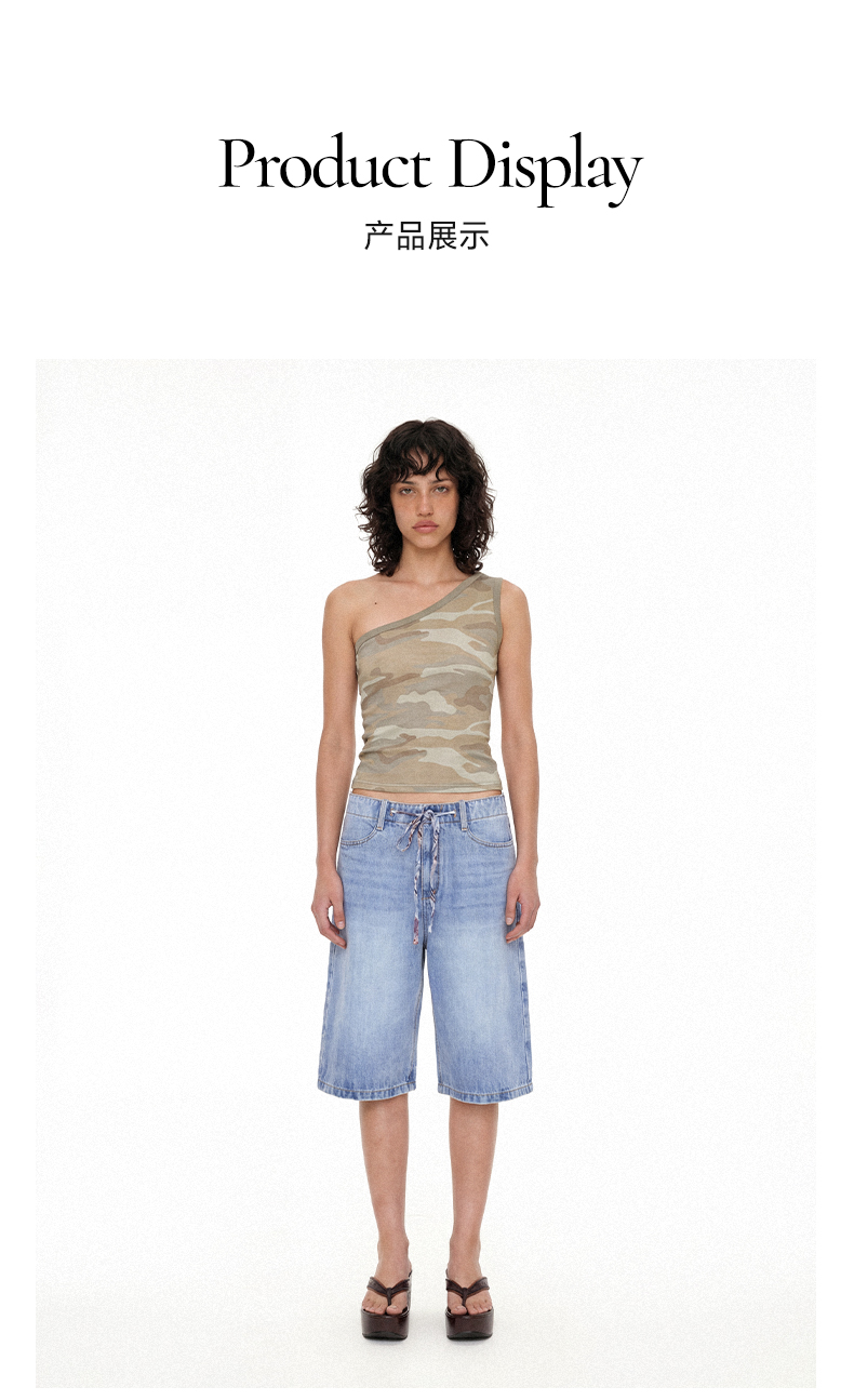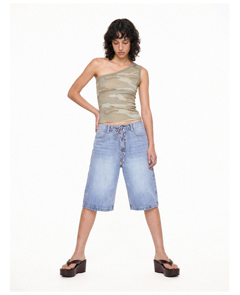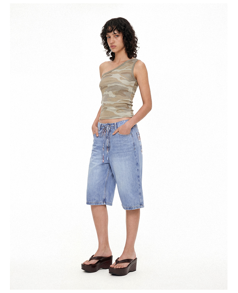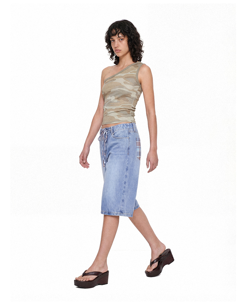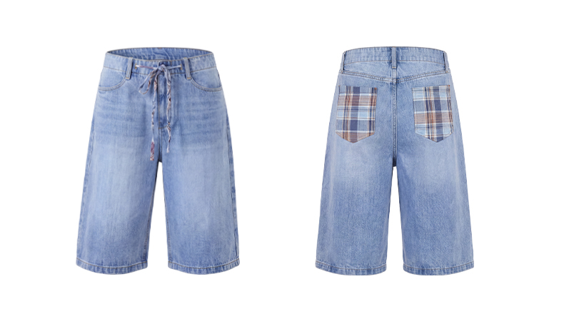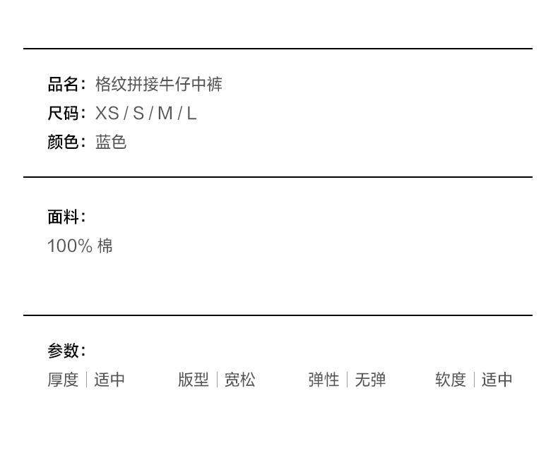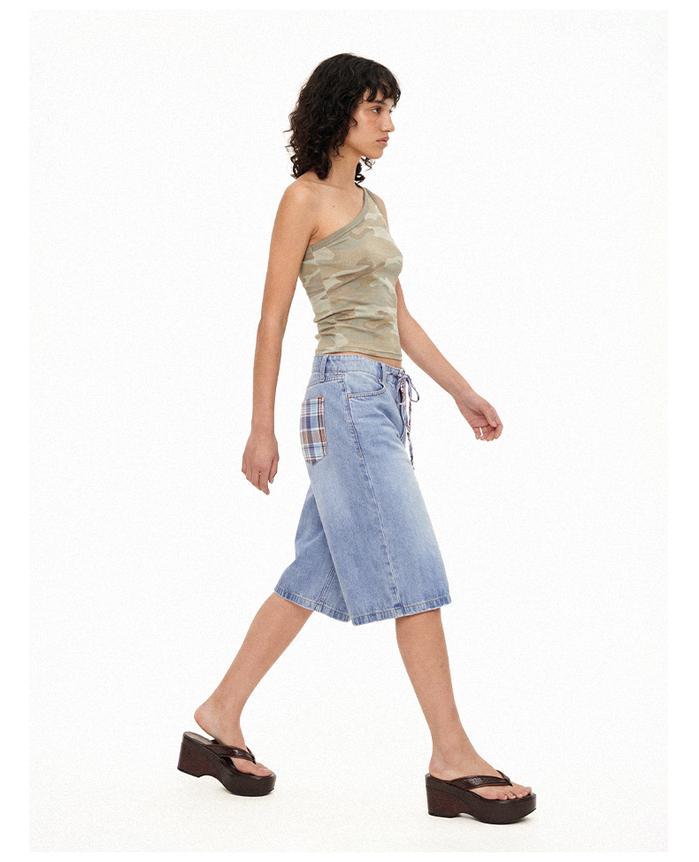 NUTH格纹拼接复古蓝色水洗牛仔中裤五分裤女(预售/发货时间同步天猫)