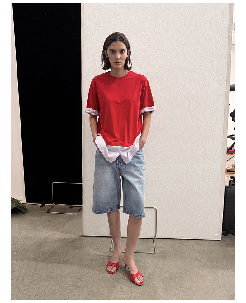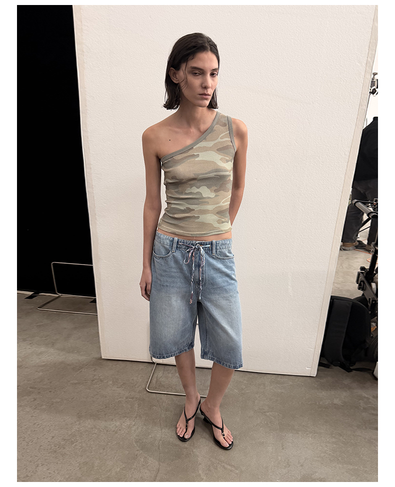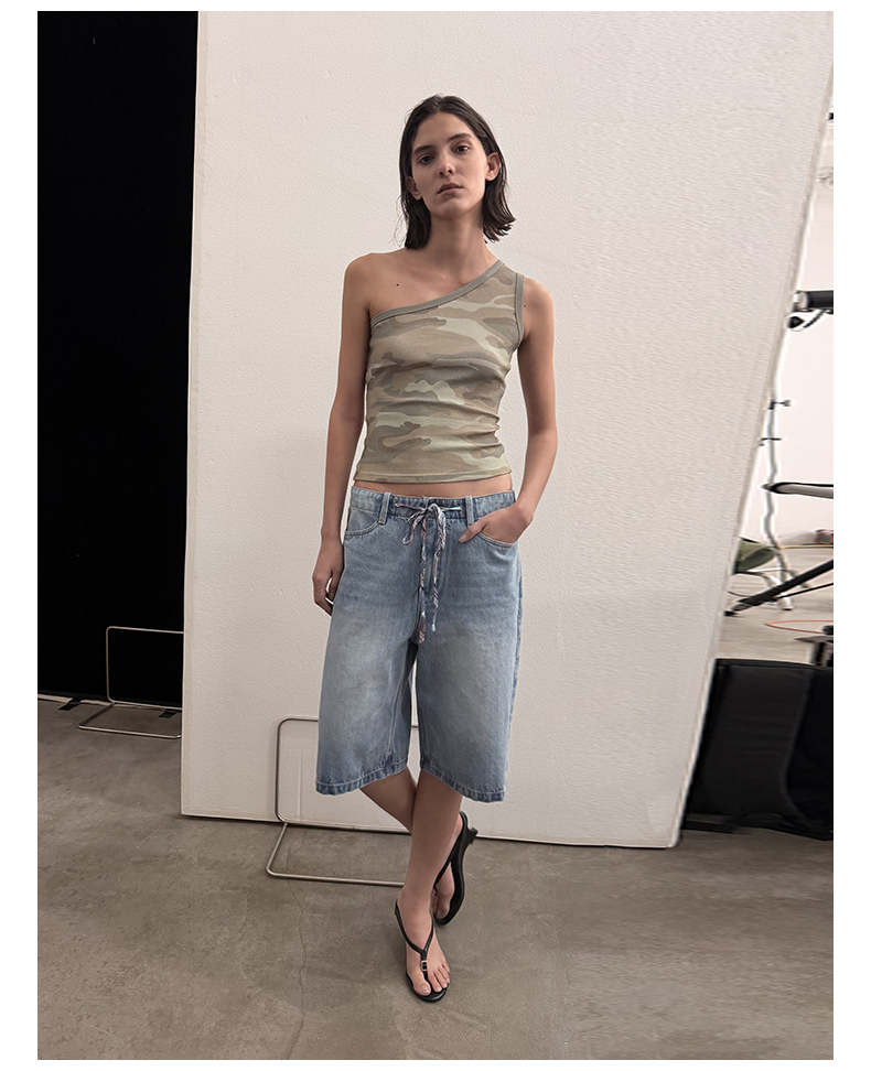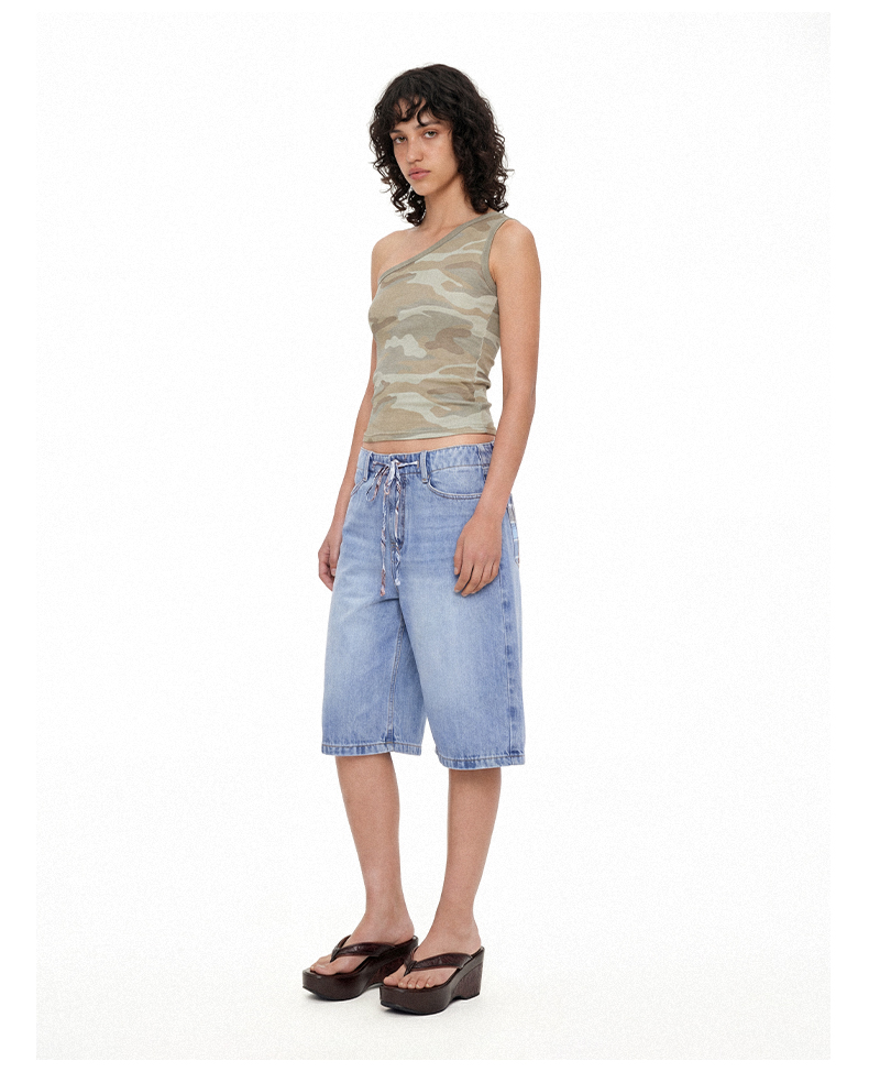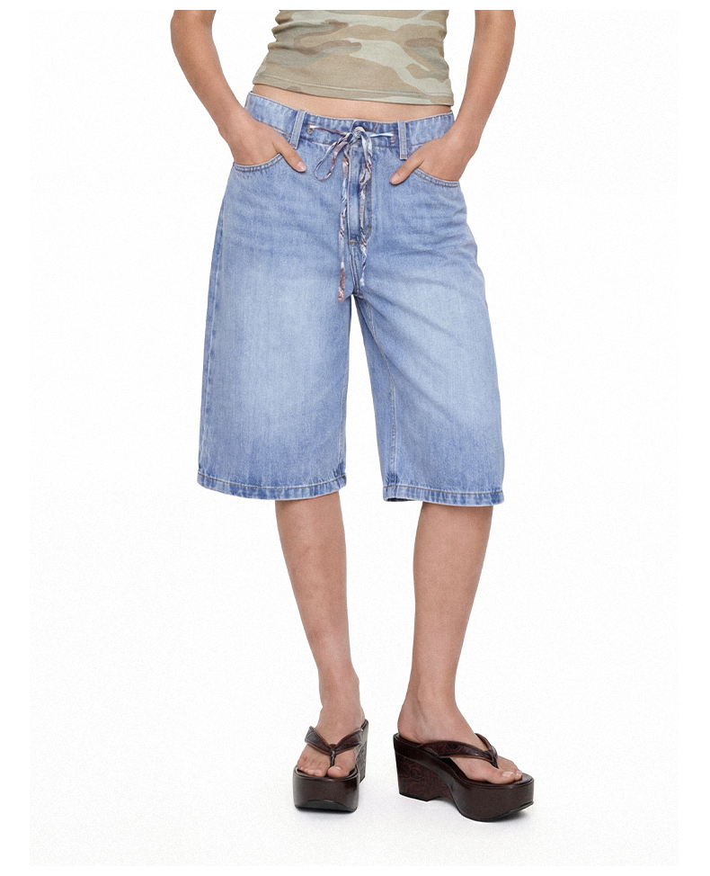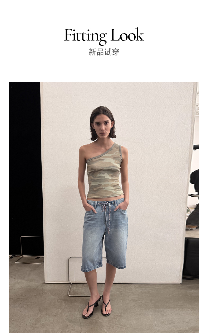 NUTH格纹拼接复古蓝色水洗牛仔中裤五分裤女(预售/发货时间同步天猫)