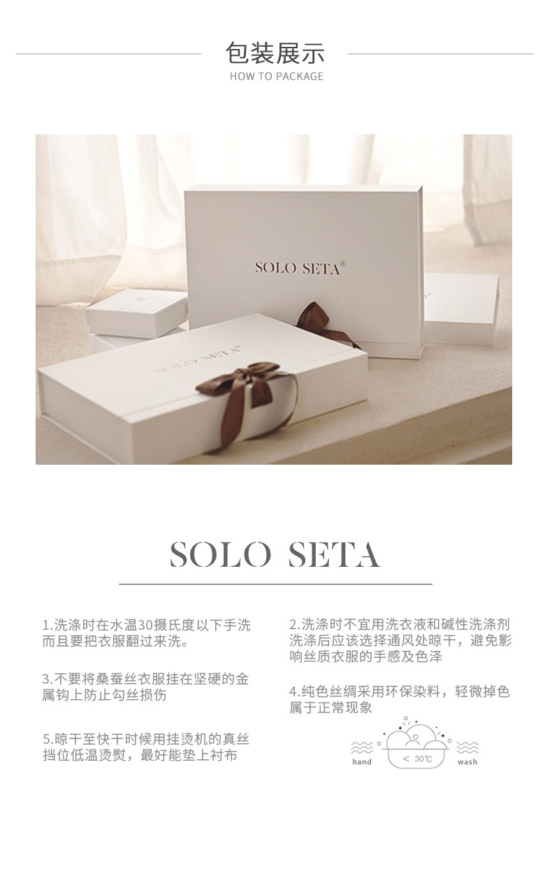 - soloseta专注于真丝织物,灵感源自意大利语,中文含义为“只做真丝”的意思。让睡衣变时尚,居家和外出瞬间切换,使其更具有出街,度假,参加宴会等功能。