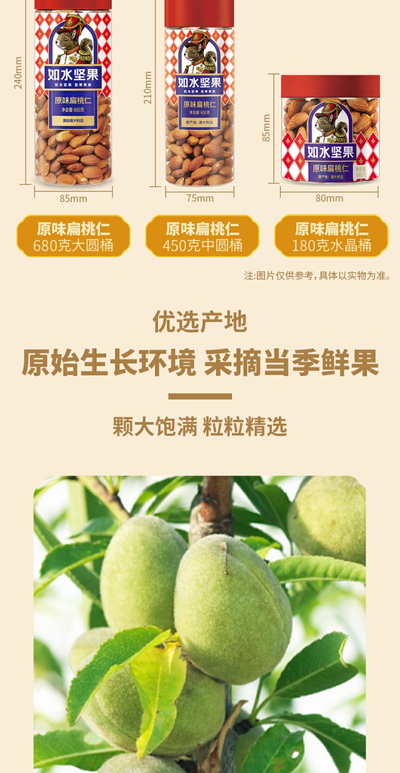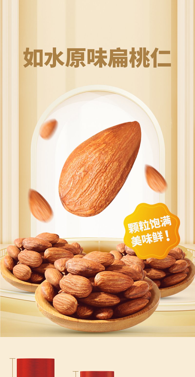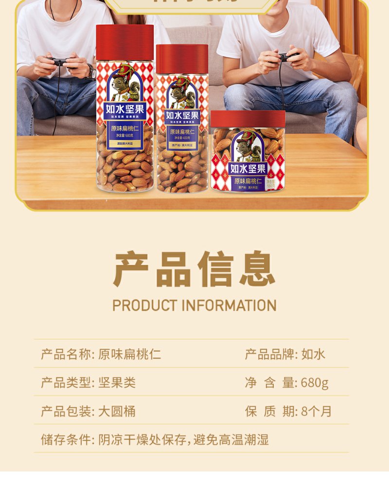 如水 原味扁桃仁 烘焙坚果仁休闲零食 680g/桶