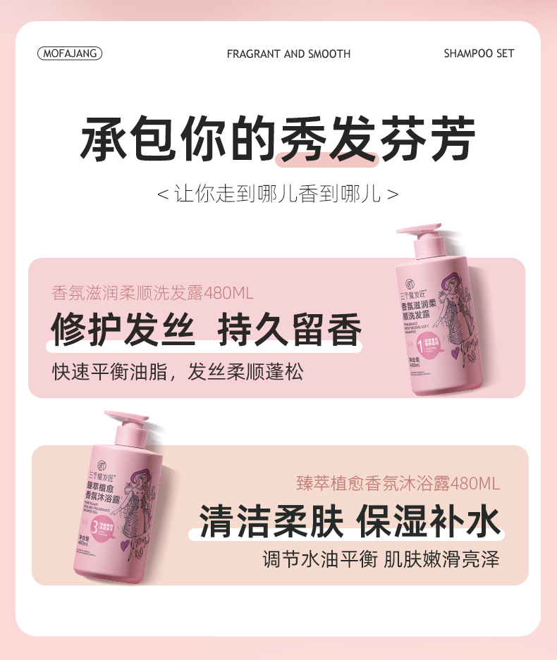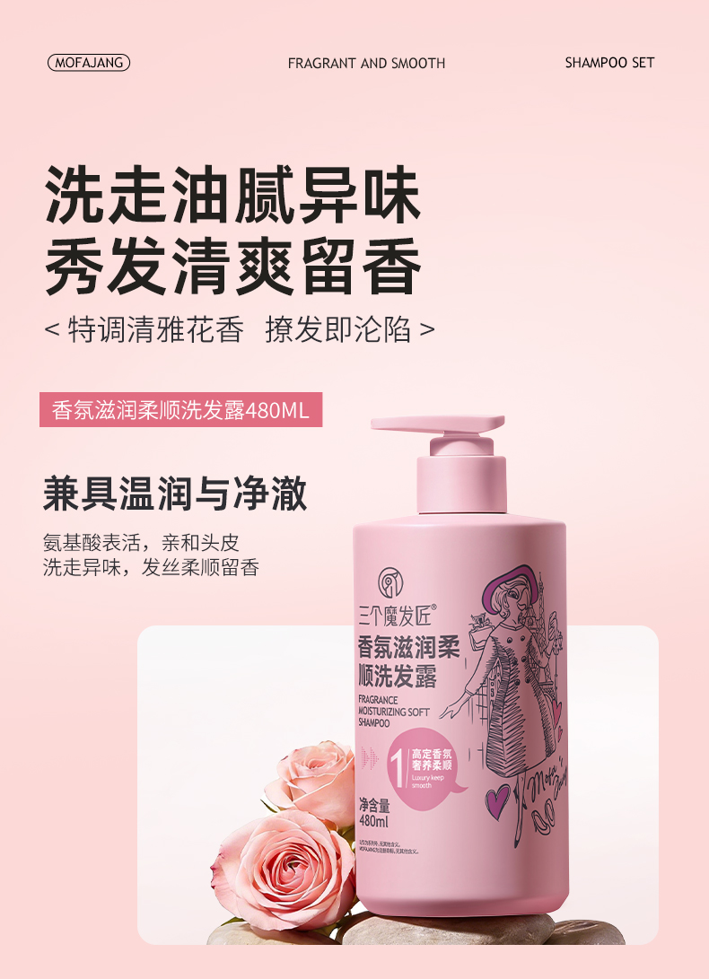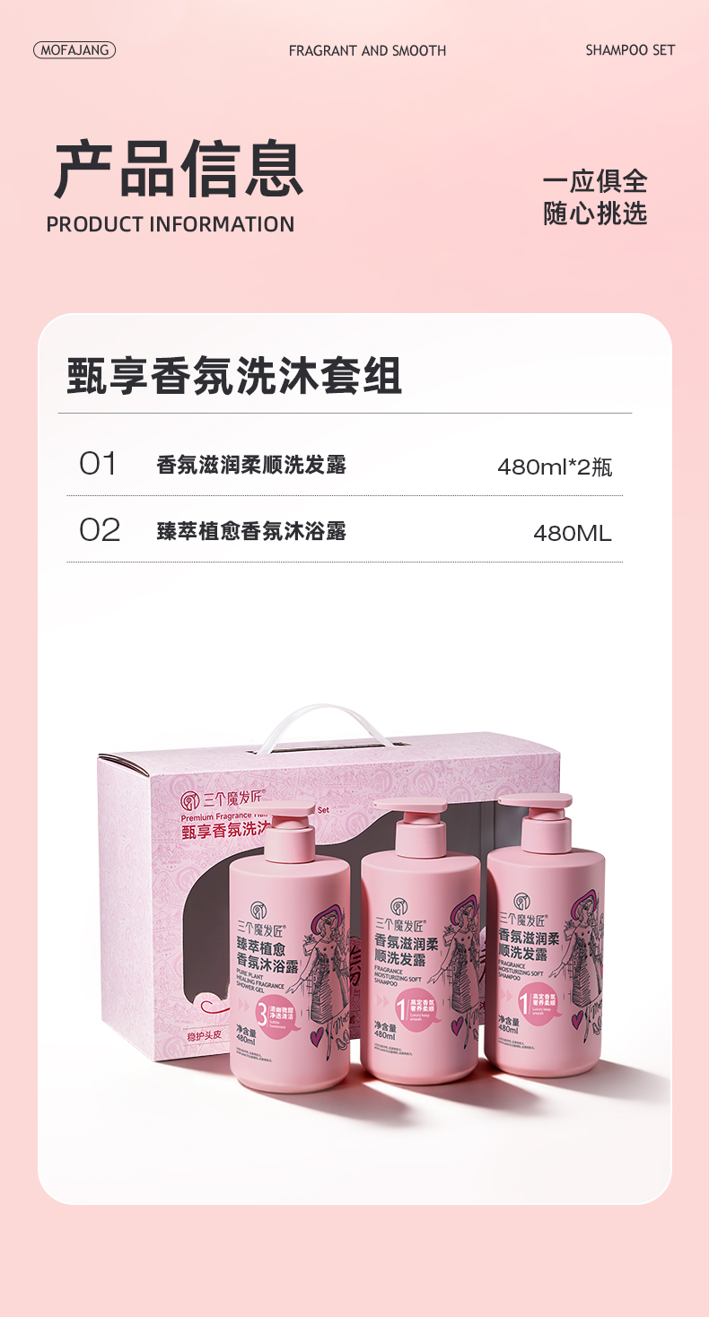 三个魔发匠香氛滋润柔顺洗发露480ml+香氛蛋白奢养润发乳480ml+臻萃植愈香氛沐浴露480ml